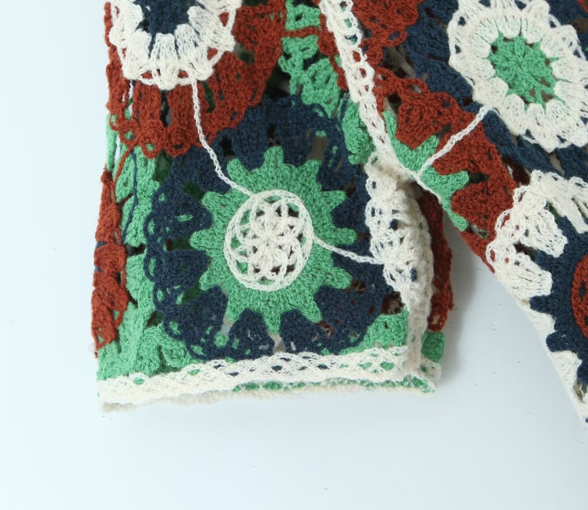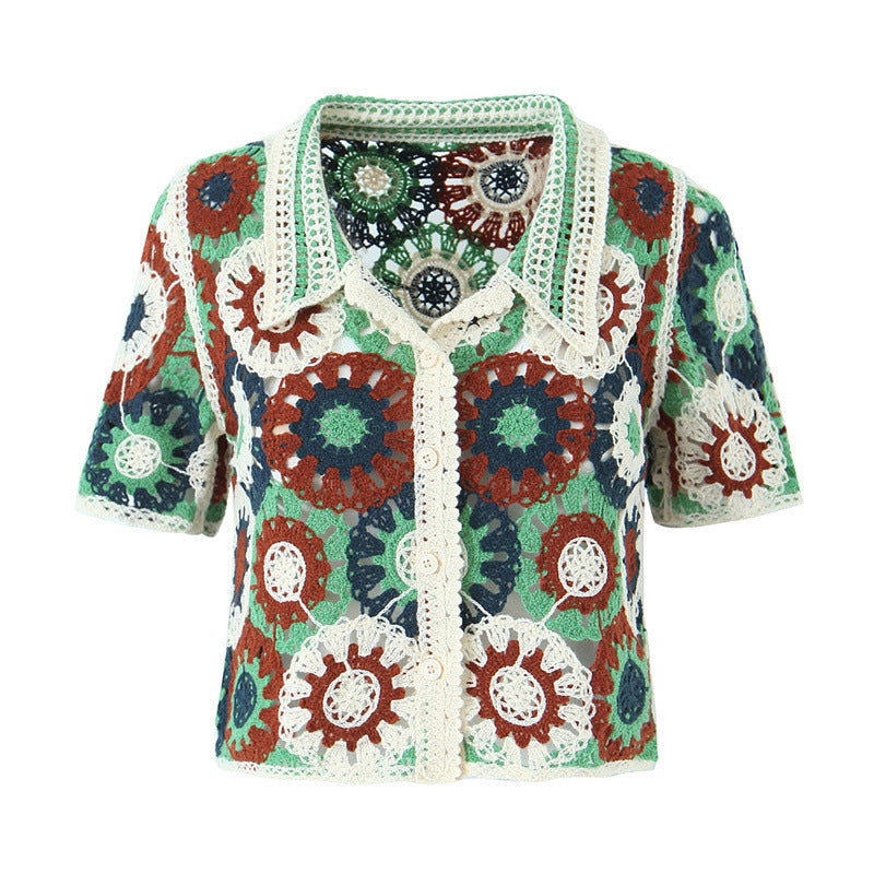 Retro Lapels Crocheted Top Spring Women Clothing Years Contrast Color Breasted Short Sweater