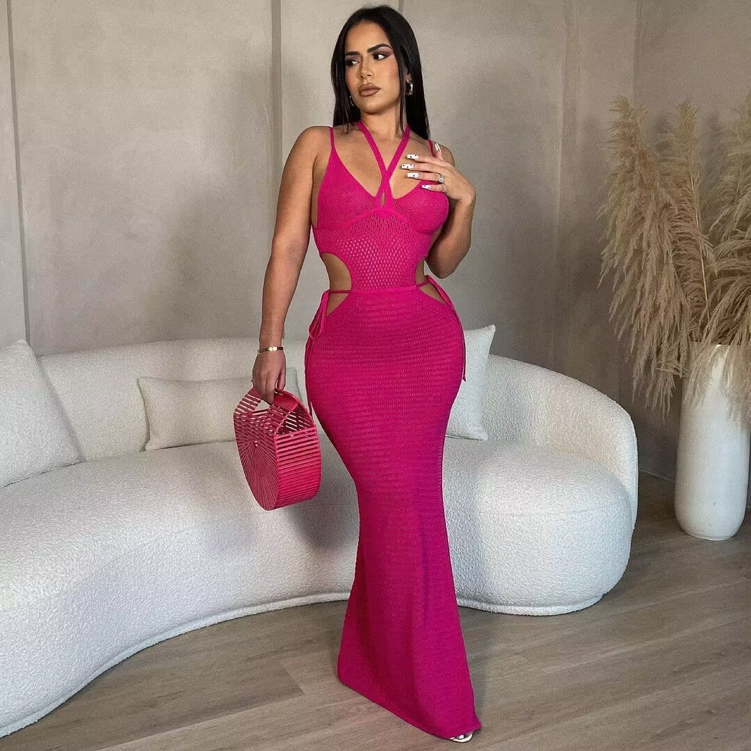 Summer Beach Hand Crochet Strap Backless Halterneck With Suspenders Mesh Split Sun Protection Dress
