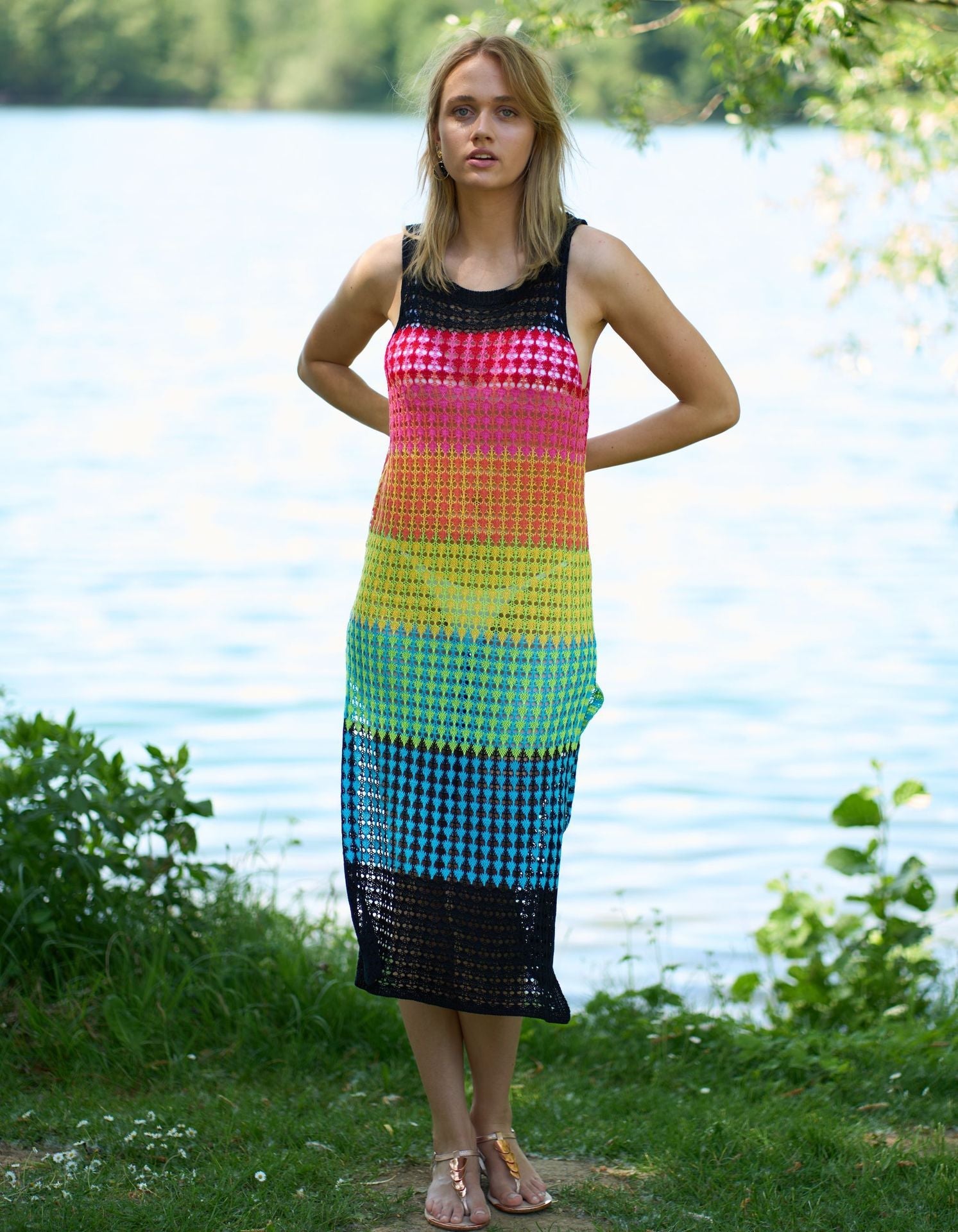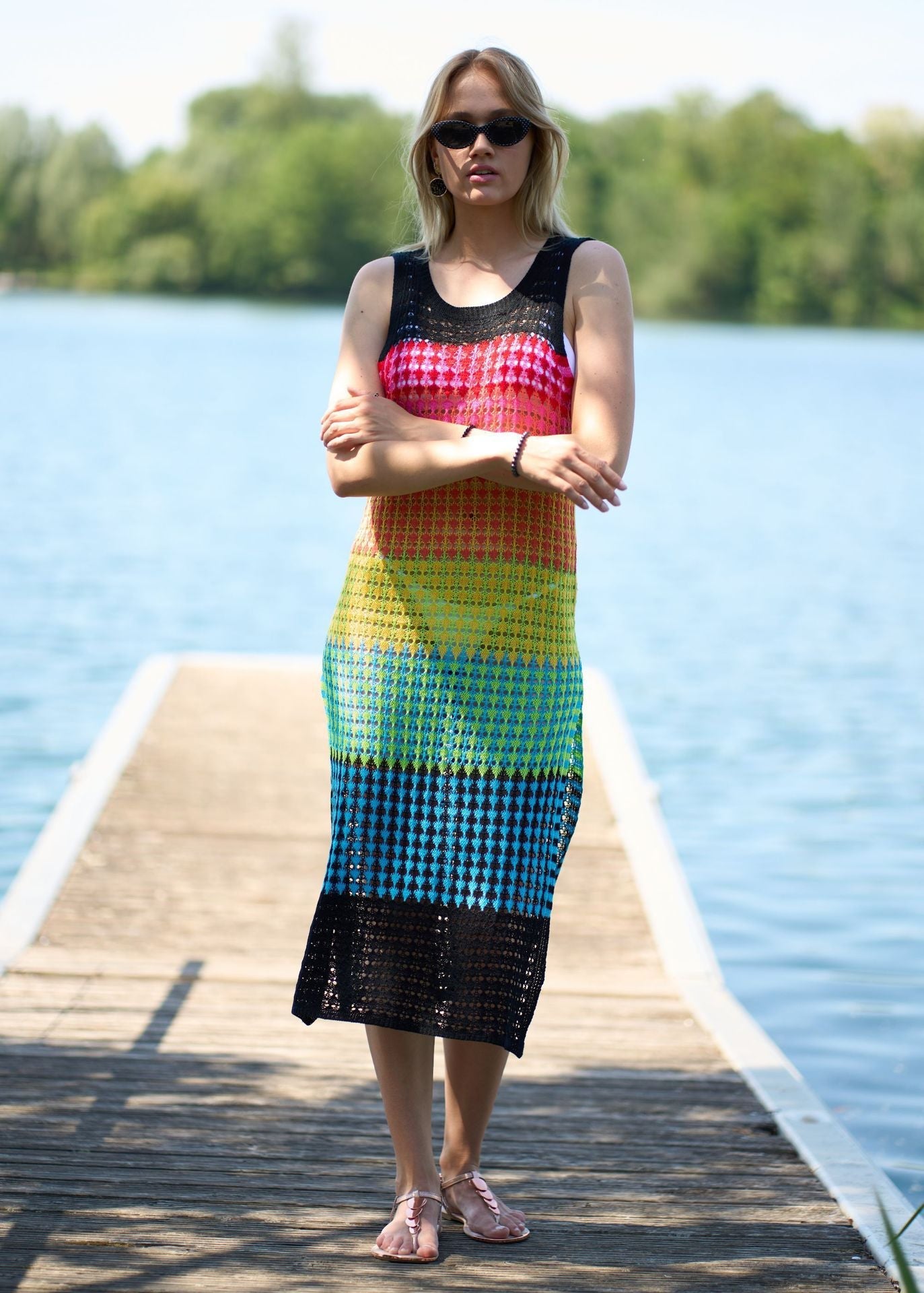 This dress blends Boho styling with vacation-ready comfort. Crafted from jersey fabric with a polyester base, it offers a soft, breathable feel and flattering drape. The knit showcases a wide horizontal color pattern with patchwork accents, creating a textured, eye-catching gradient from top to bottom.