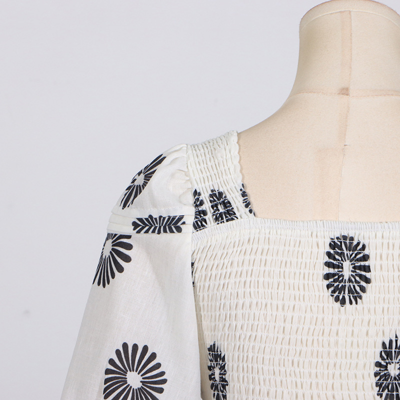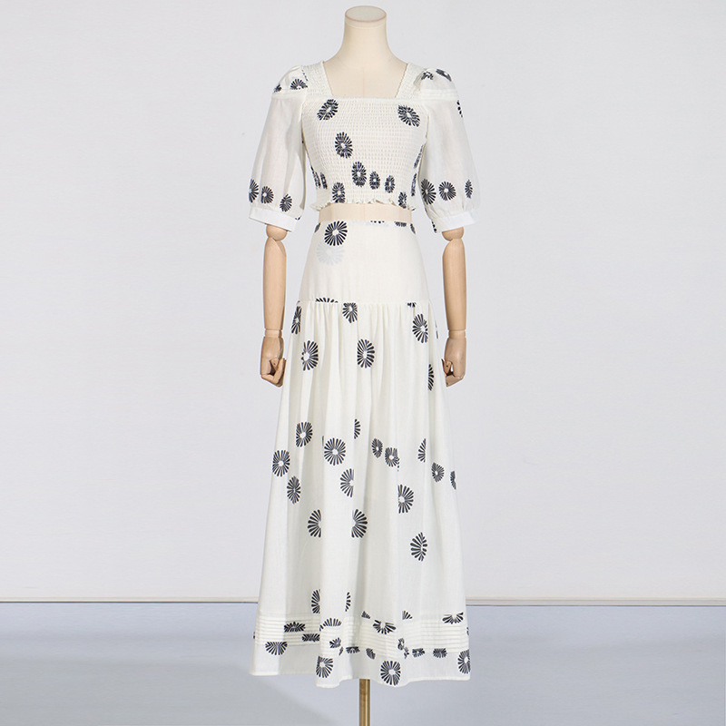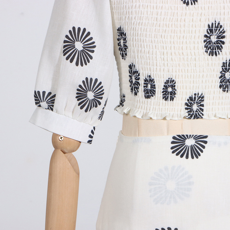 Korean Casual Summer Square Collar Puff Sleeve Peplum Top High Waist Print Skirt Set