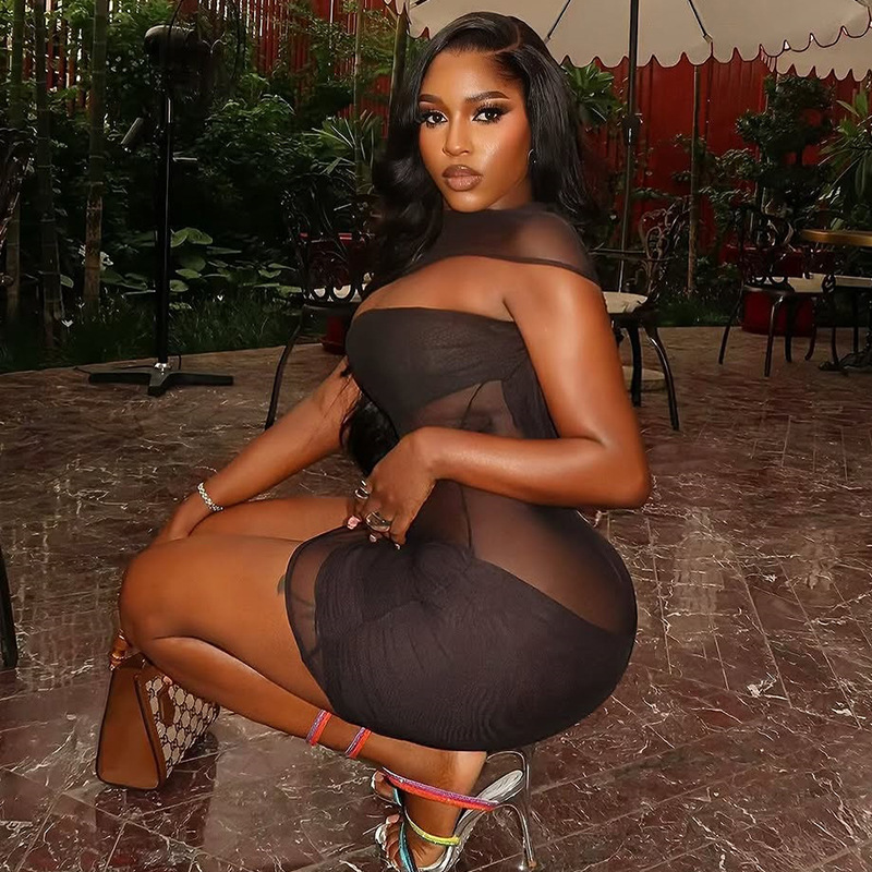 Personality Hipster Women Clothing Sexy See through Slim Hip Skirt Hollow Out Cutout High Collar Solid Color Short Dress