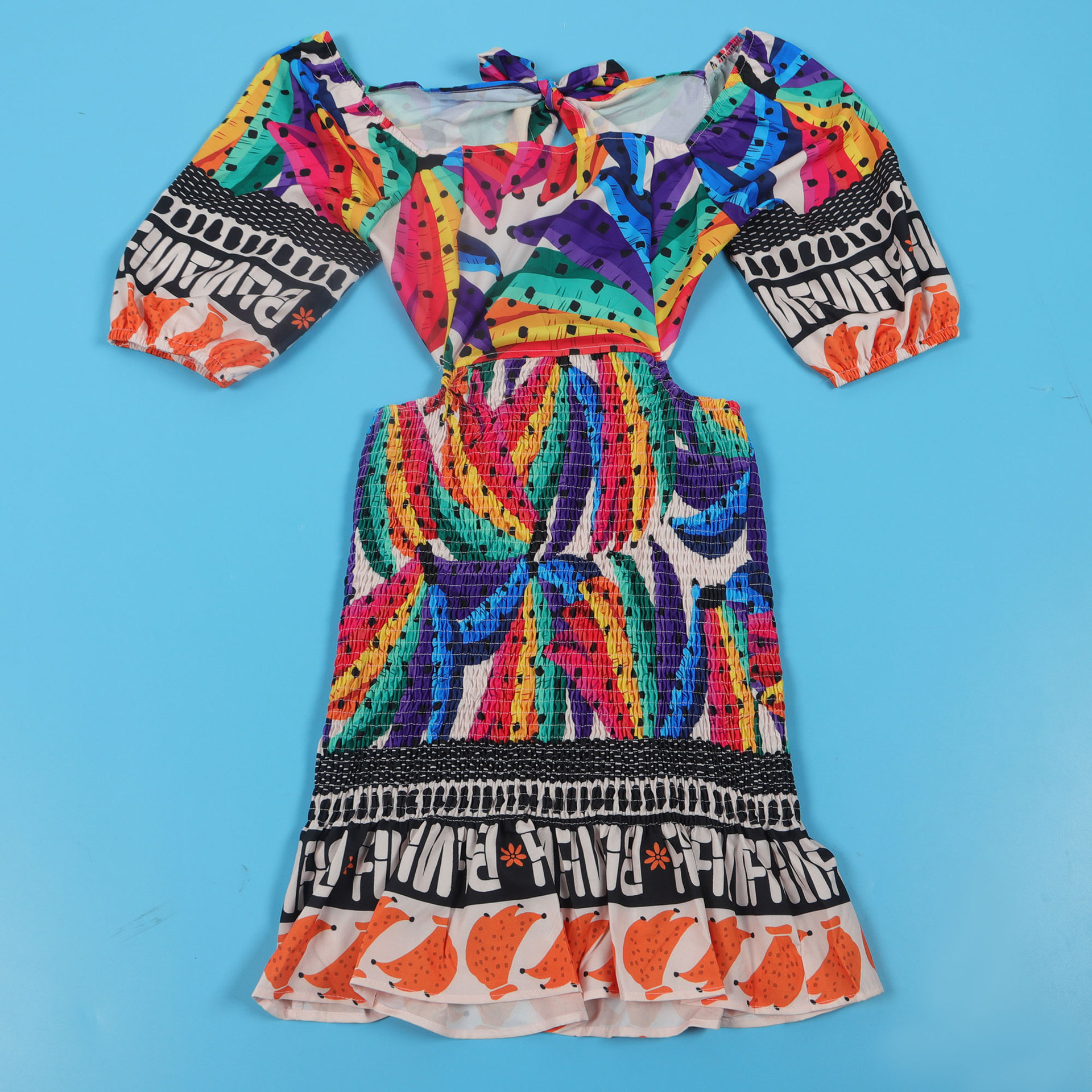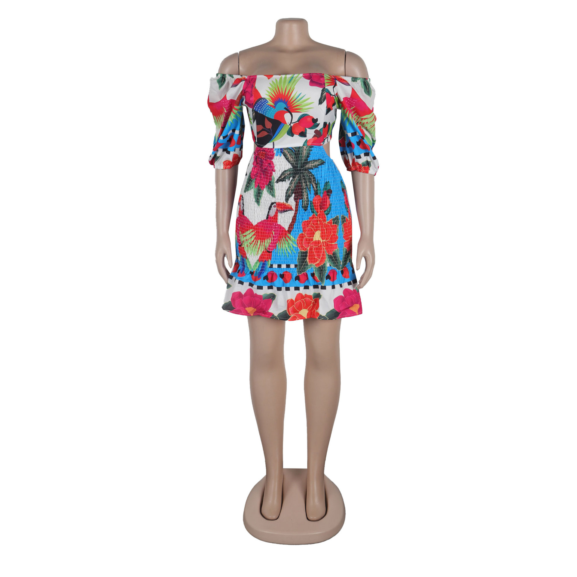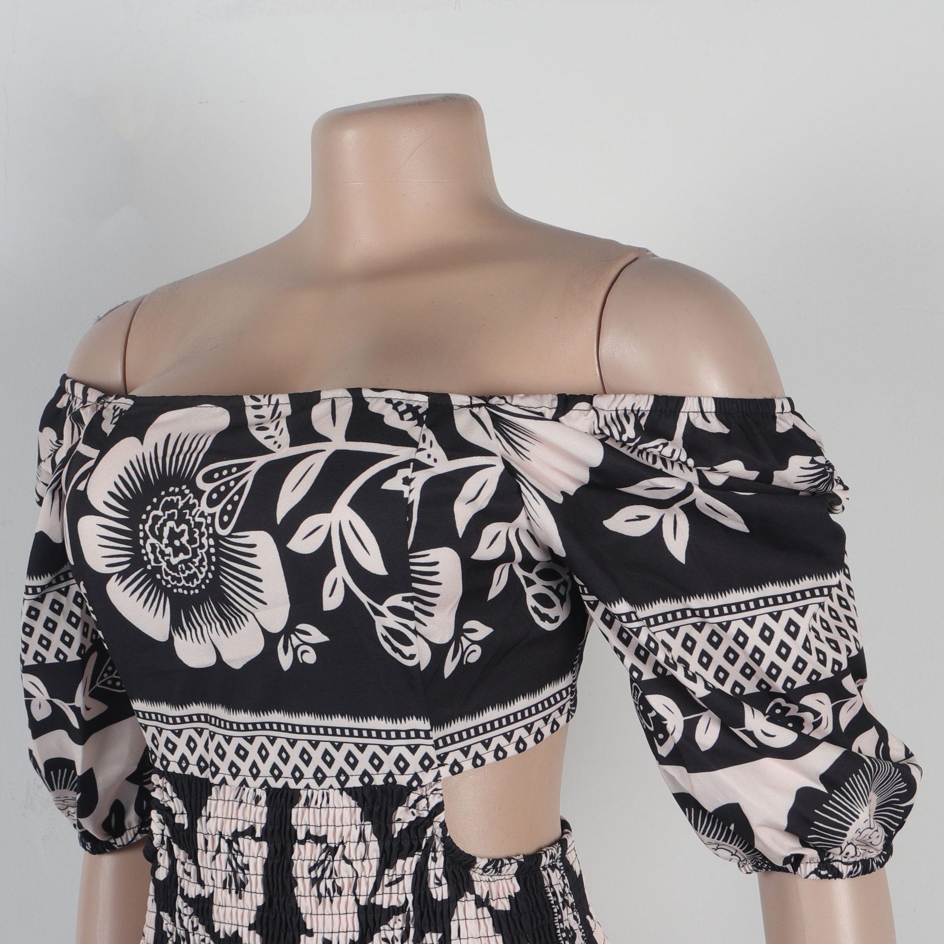 Printed Waist Controlled Backless Lantern Sleeve Smocking Off Shoulder Two Way Wear Dress Bella Mia