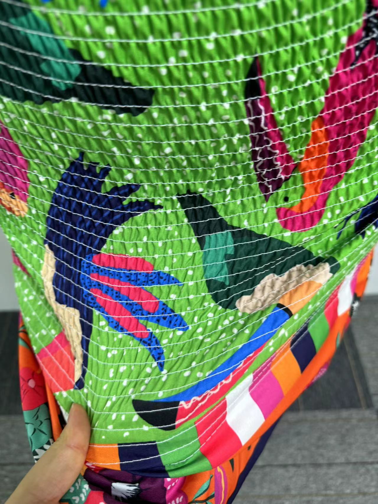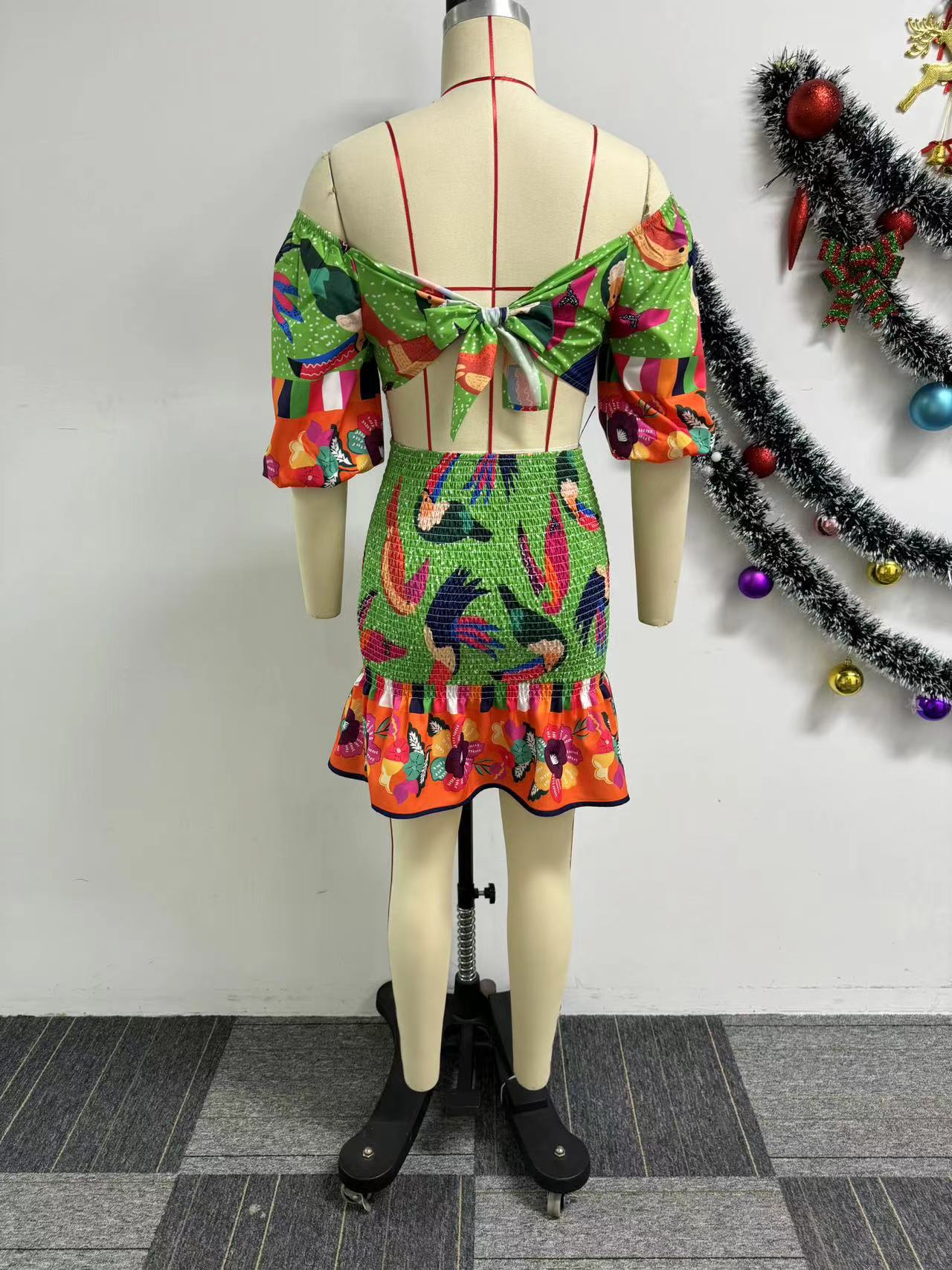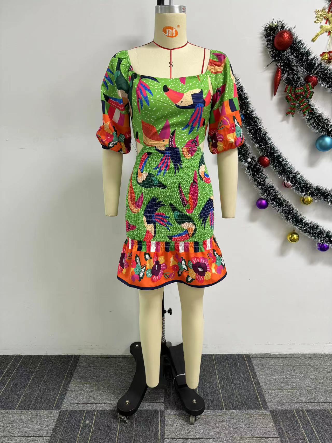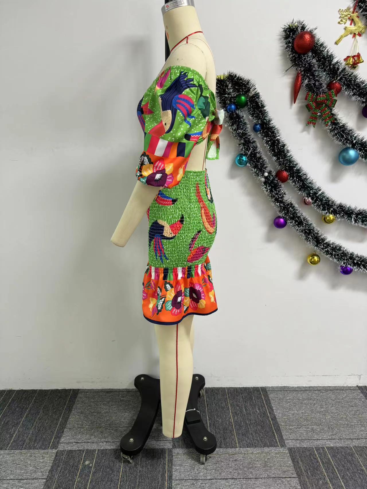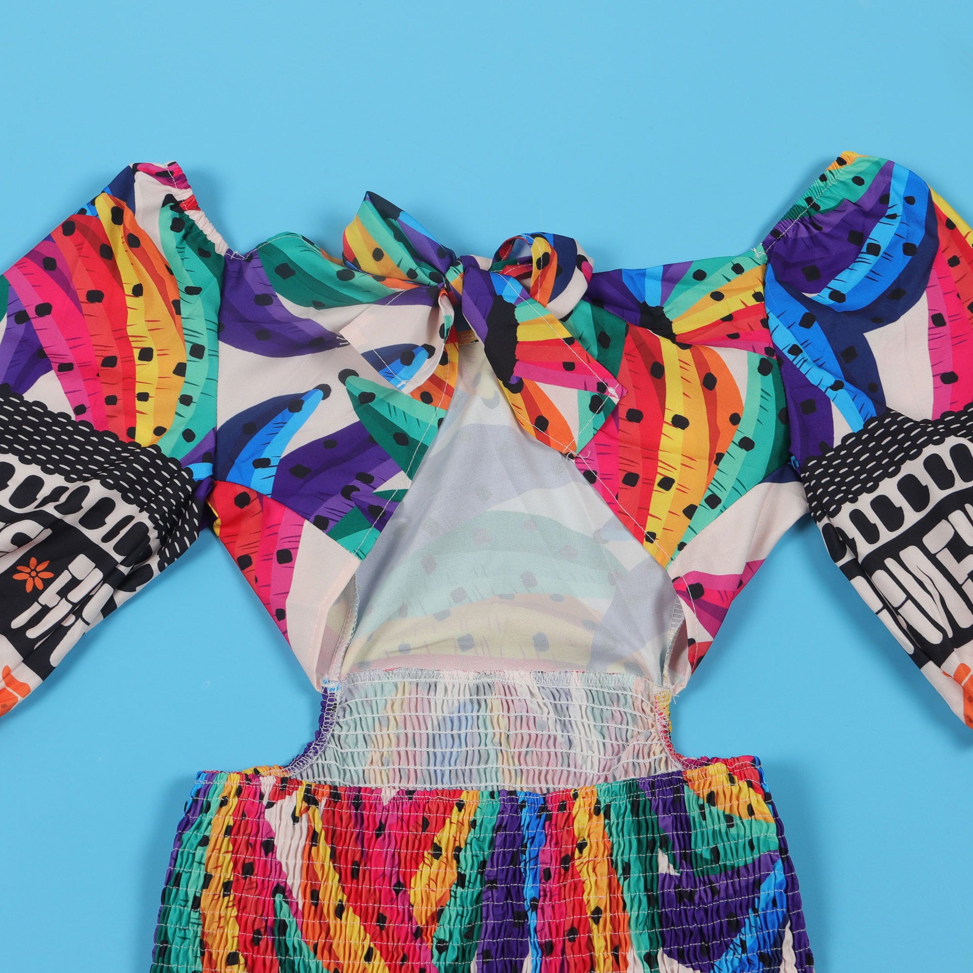 Printed Waist Controlled Backless Lantern Sleeve Smocking Off Shoulder Two Way Wear Dress