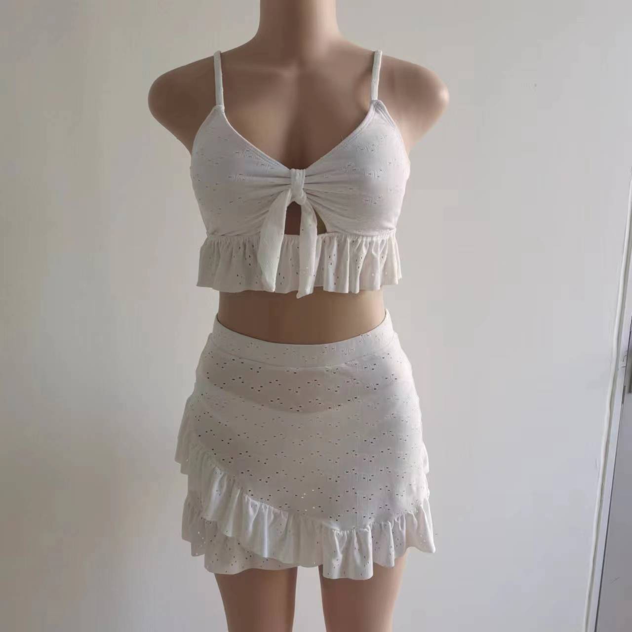 Boho-inspired three-piece swimsuit set in crisp white with eyelet embroidery and soft ruffle details. The tie-front crop top features a playful knot at the bust, a flattering V-neck, and a cropped length for a breezy summer silhouette. A high-waisted bottom provides secure coverage, while a coordinating skirt overlay adds movement and coverage, creating a layered, vacation-ready look. Crafted from lightweight polyester, the fabric offers comfortable wear in hot weather and easy care for beach days.