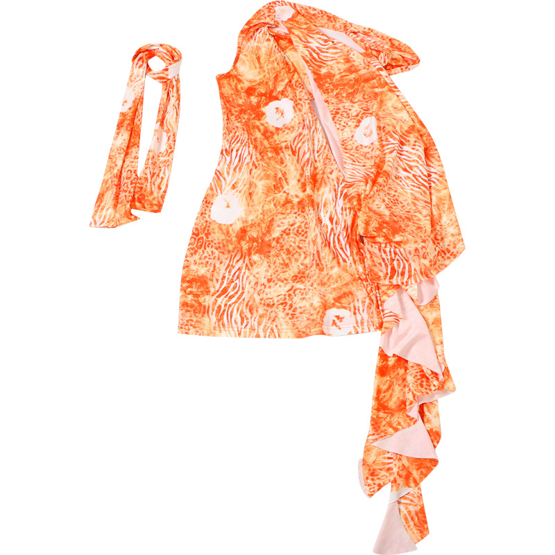 The dress combines an oblique shoulder with hollow-out and cutout details to create a bold, contemporary silhouette. Constructed from polyester, it offers a lightweight finish with a smooth hand for warm weather. The color-contrast print enhances the modern look while the backless profile adds evening appeal.