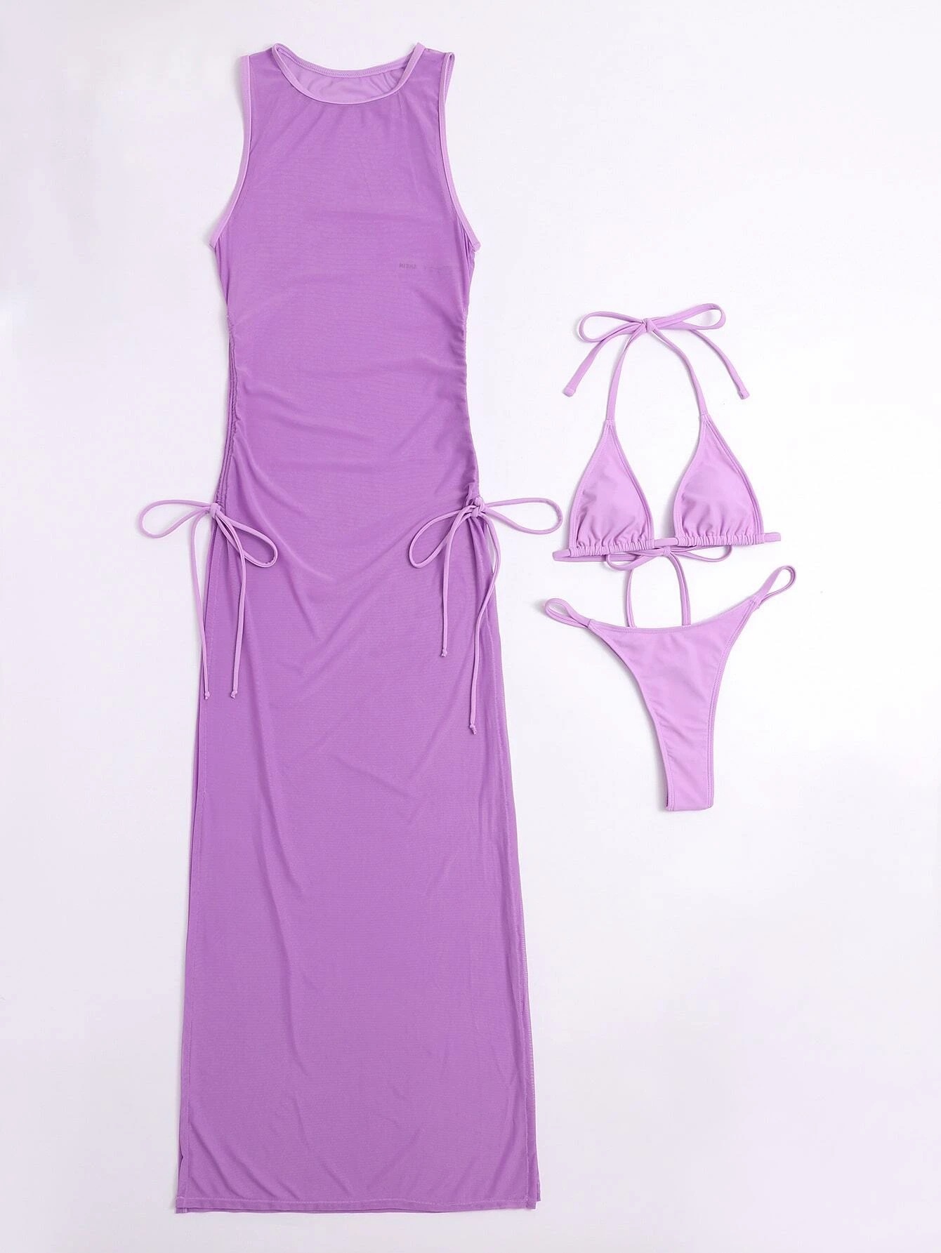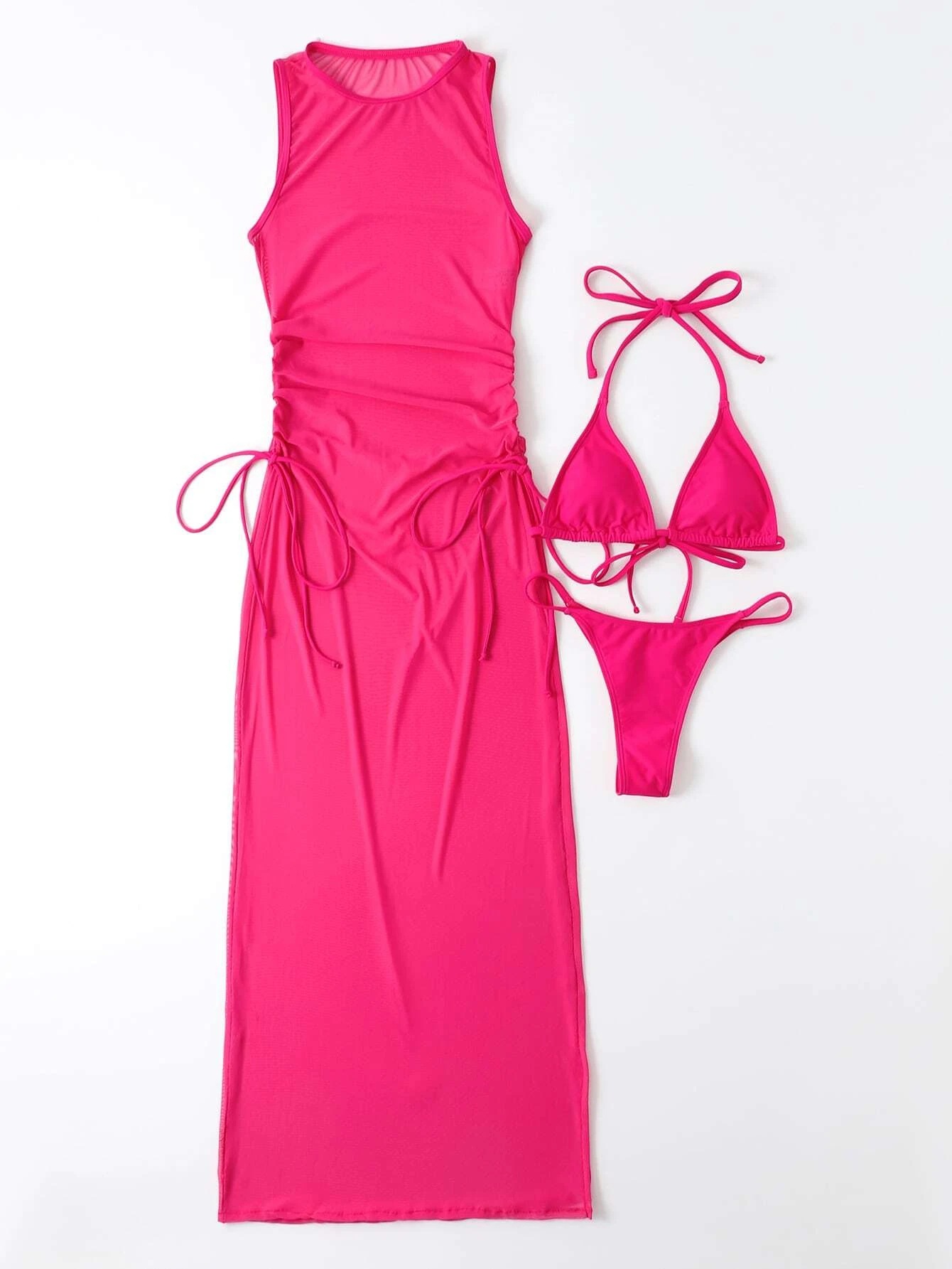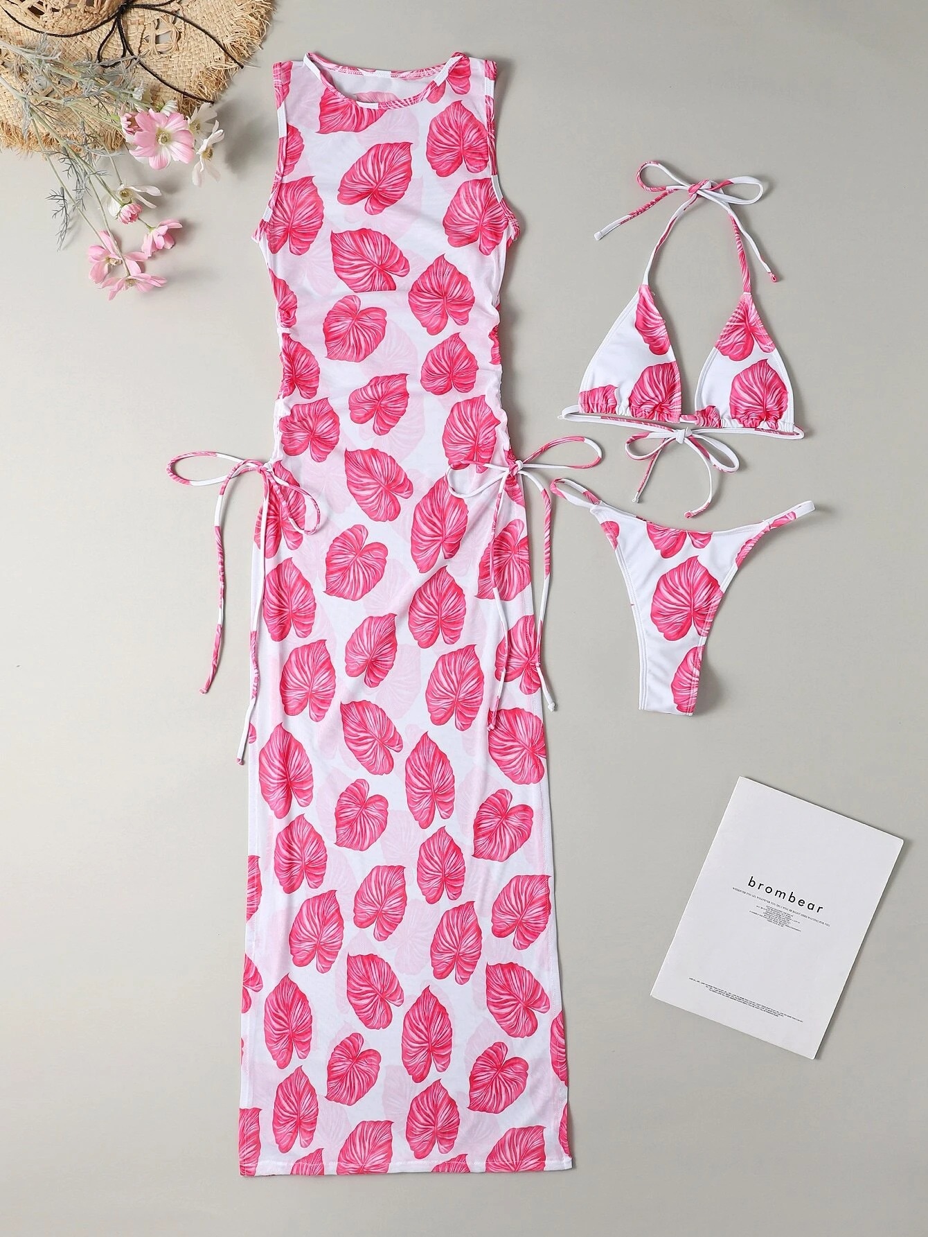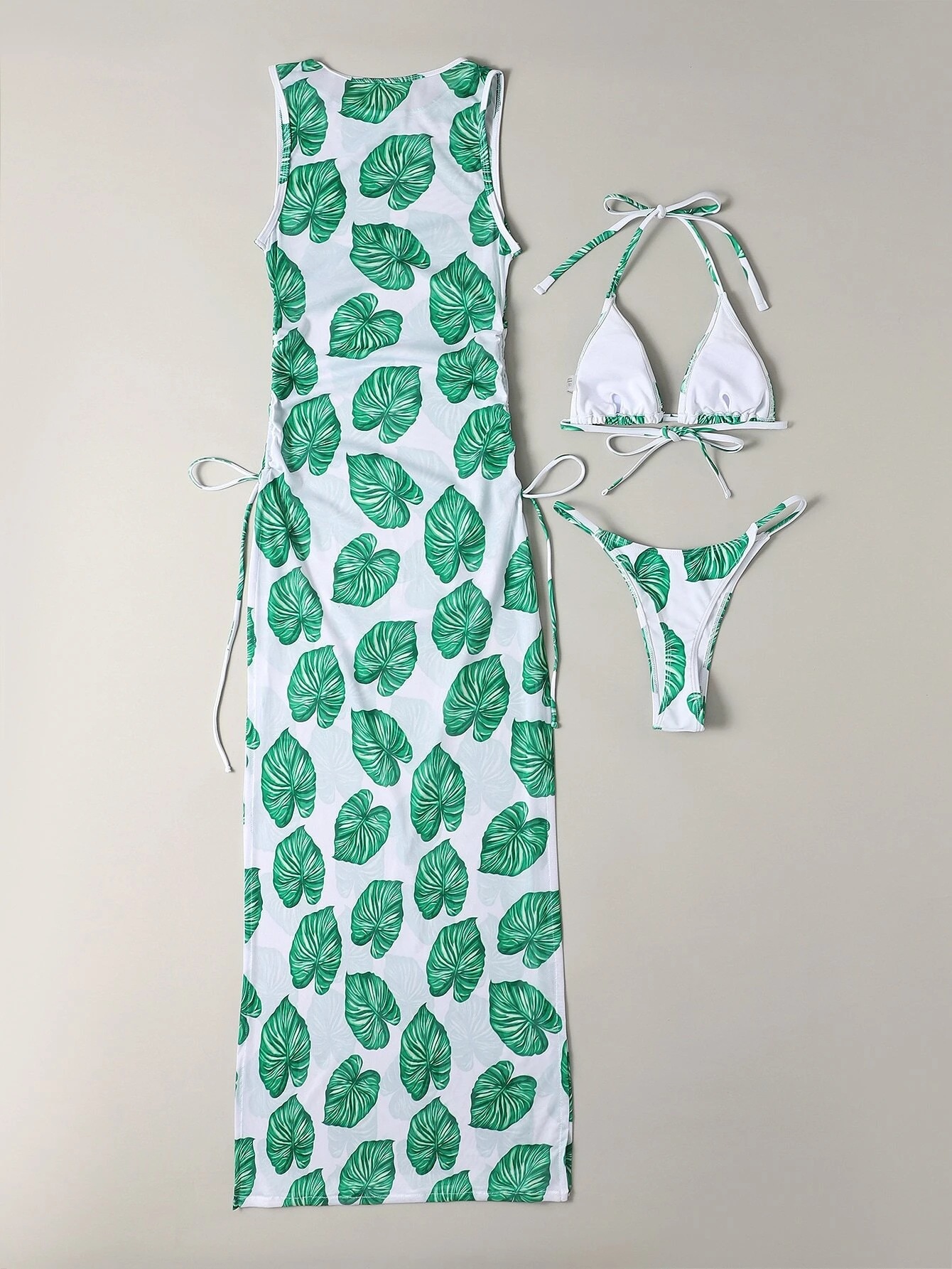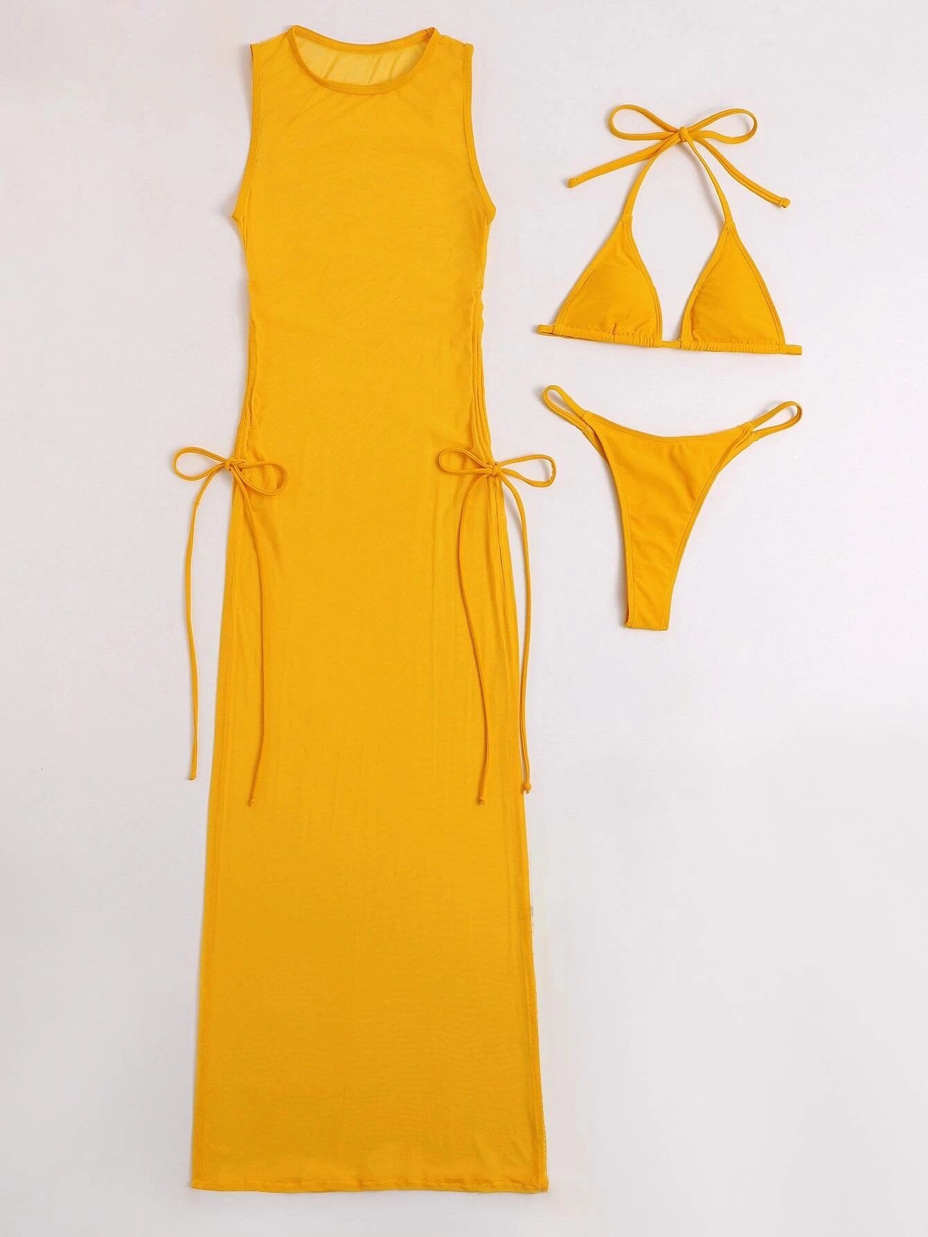 This stylish women's swimsuit embodies a boho vacation vibe with a regular fit, crafted from lightweight polyester fabric for comfortable wear during summer activities. Featuring a solid color design accented by tropical patterns and mesh details, it includes tie elements for adjustable sizing and a sleeveless silhouette that allows for unrestricted movement. Ideal for beach outings or poolside relaxation, the three-piece set—consisting of a top, bottom, and coordinating piece—offers versatile coverage and a flattering maxi-length bottom for added elegance.