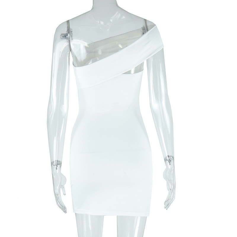 Elevate evening style with a solid color dress crafted in polyester for a smooth drape and comfortable fit. The design features a diagonal, one-shoulder neckline with cutout details and an asymmetric silhouette that creates a modern, slimming look. This sleeveless, short-length bodycon dress hugs the figure while maintaining ease of movement. Suitable for party and club settings in warm seasons, it pairs well with metallic accessories and neutral heels for a polished finish.