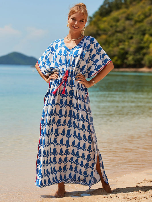 Printed Pull Belt Robe Vacation Casual Beach Bikini Cover
