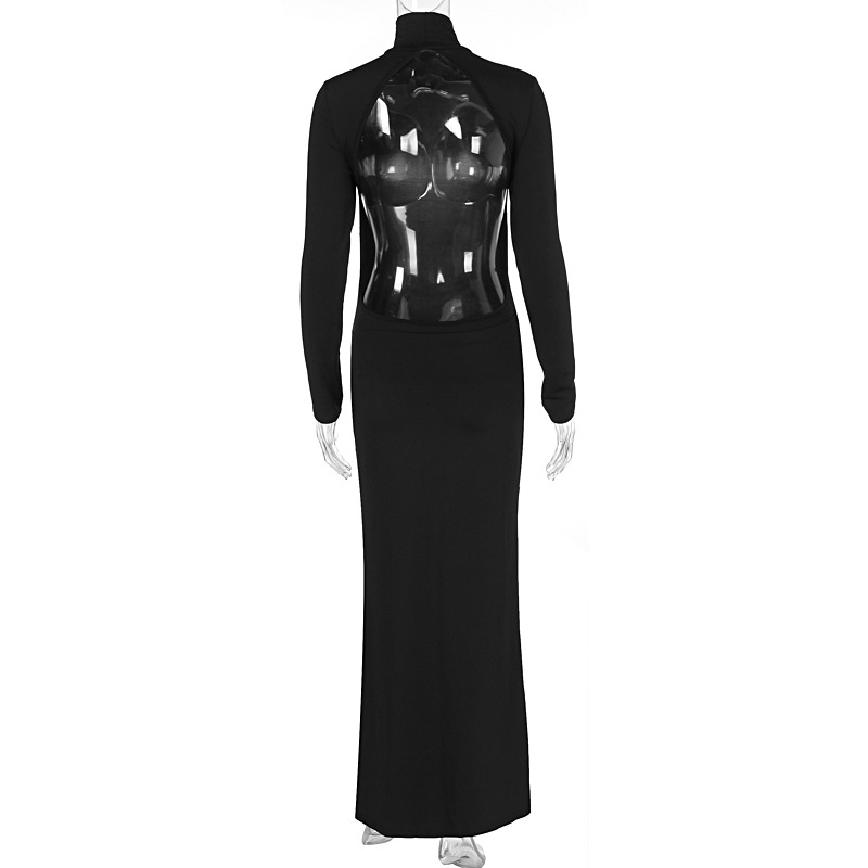 Autumn Women High Collar Backless Long Sleeves Jumpsuit Sexy Slit Dress