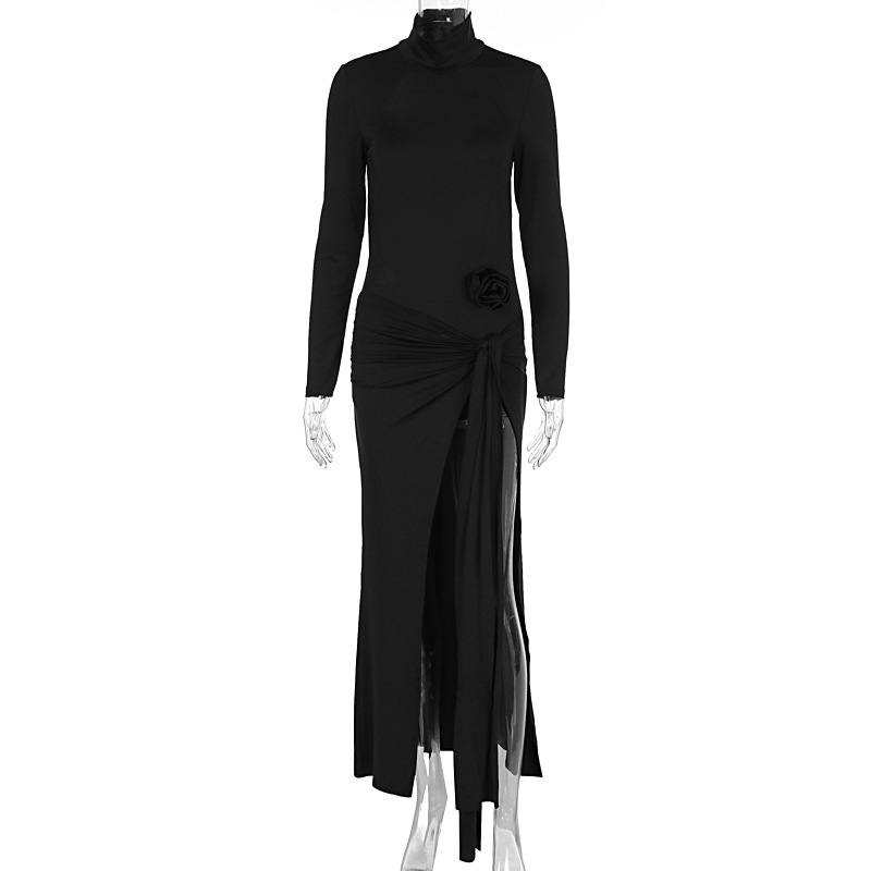 This solid red maxi dress offers a sleek, bodycon silhouette crafted from polyester for a smooth drape and lasting shape. A high, turtle-neck collar pairs with long sleeves for a refined autumn look. The design features a backless detail, ruched waist with a decorative rose accent, and a dramatic side slit that reveals movement with every step. The piece is finished with a maxi length and a subtle 3D embellishment at the waist for dimension.