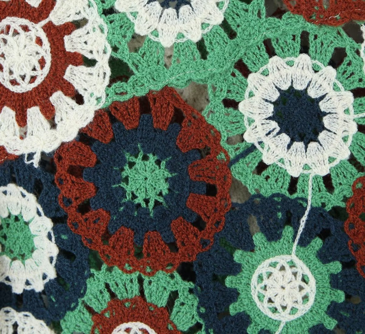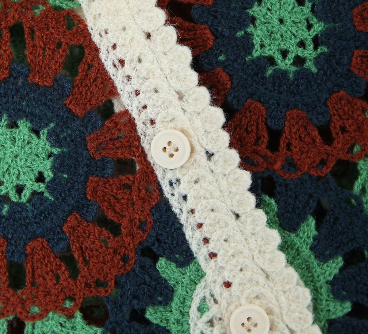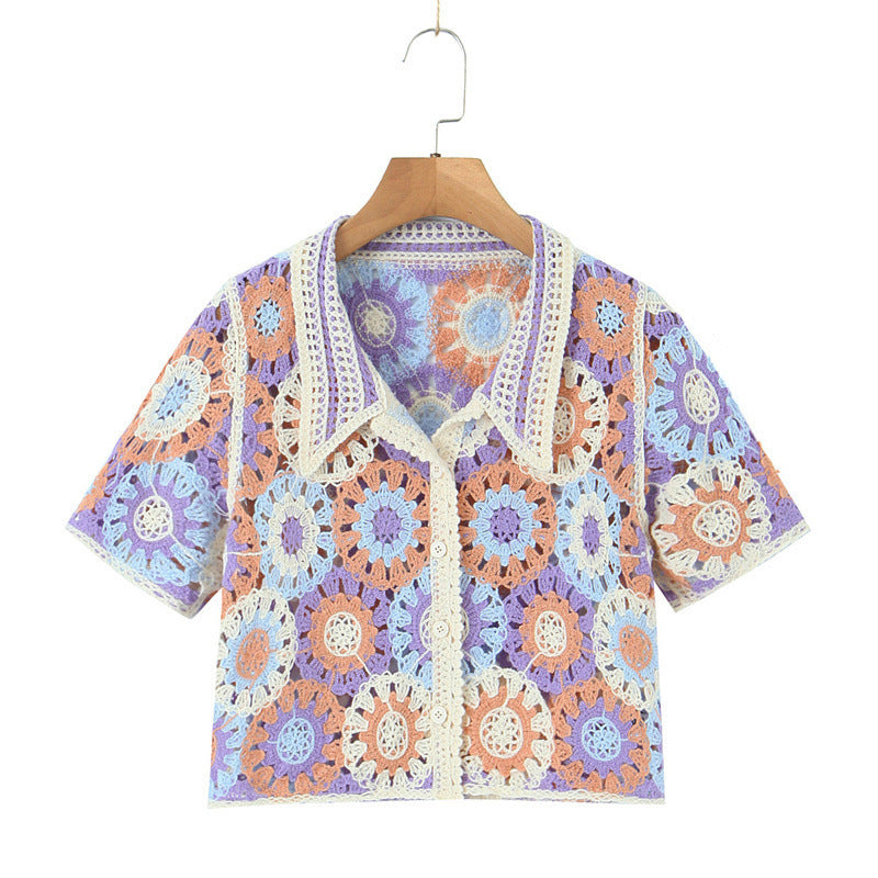 This lightweight crocheted top blends vintage charm with modern comfort. Crafted from acrylic, it features a multicolor floral motif created by circular crochet panels. Short sleeves, a classic collared neckline trimmed with white lace, and a button-front closure provide a refined, boho-inspired look ideal for spring and summer wear. The regular fit offers everyday versatility, while the lace detailing along the placket and hem adds a delicate finish.