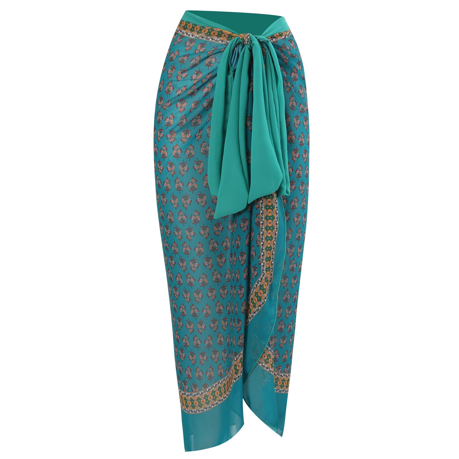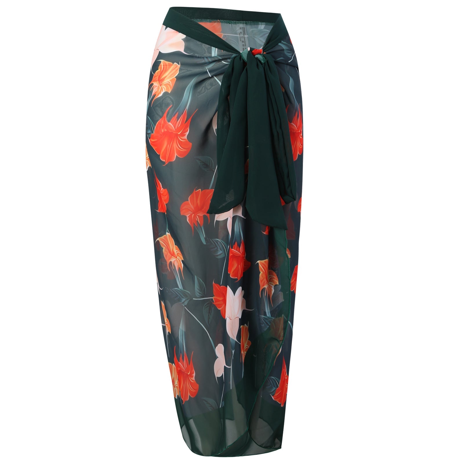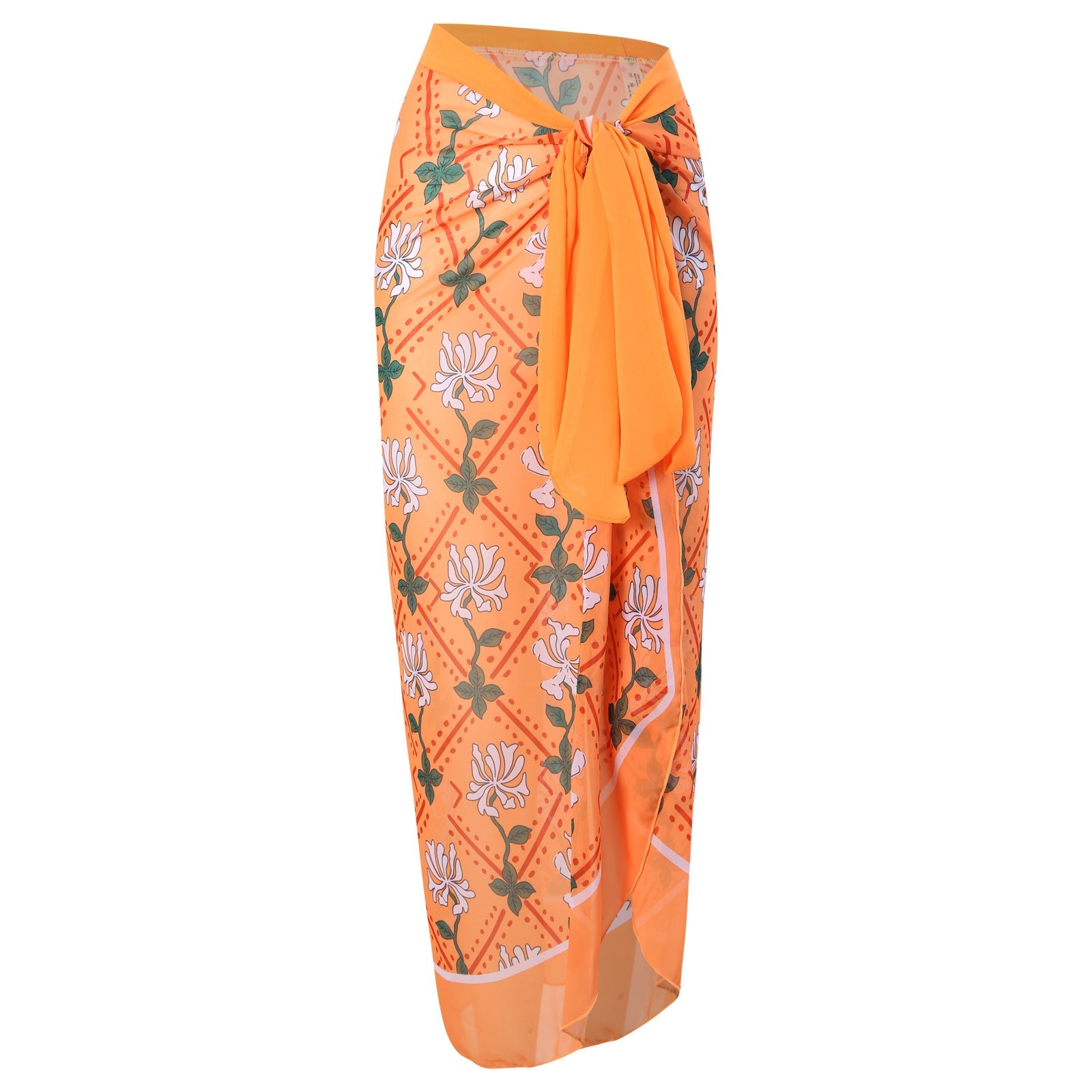 The bold floral pattern features warm orange tones, white blooms, and green leaves, delivering a boho vacation vibe suitable for resort pools and tropical getaways. The wrap skirt provides modest coverage when worn over the swim set and can be tied at the waist to suit your silhouette. This design is sleeveless, making it comfortable in hot weather, and it is positioned as a summer-ready option for swimwear and cover-up uses.