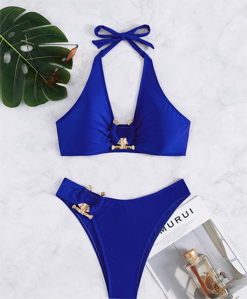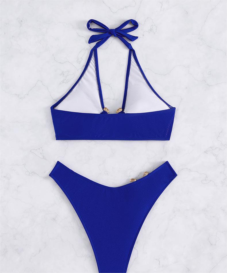 This solid-color bikini combines a high-waist bottom with a tube-top silhouette to create a flattering, streamlined look. The halter neck ties for an adjustable fit, while a central metal accent adds understated hardware detail. Made from polyester, this swimsuit resists fading and dries quickly after sun and water exposure, ideal for summer wear.