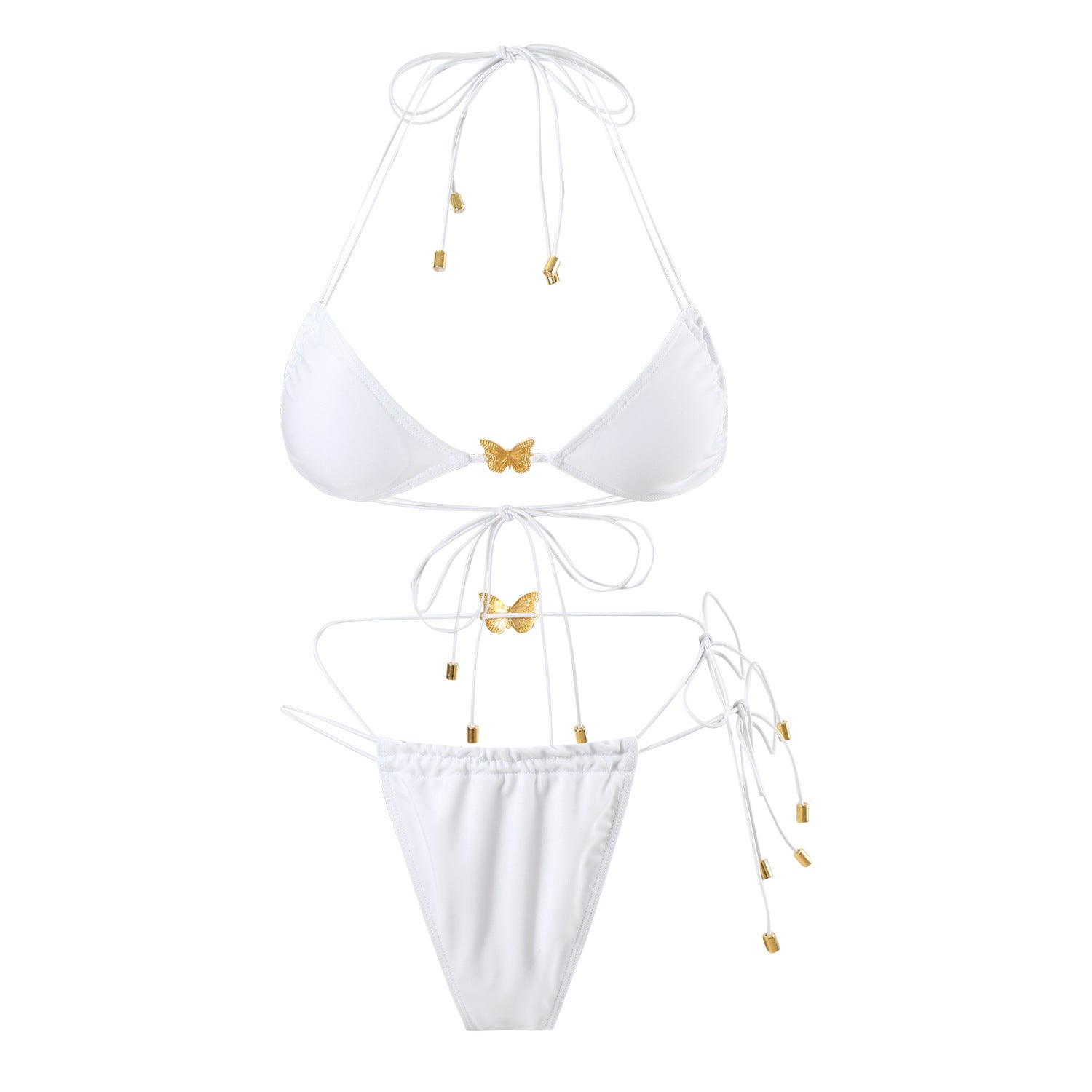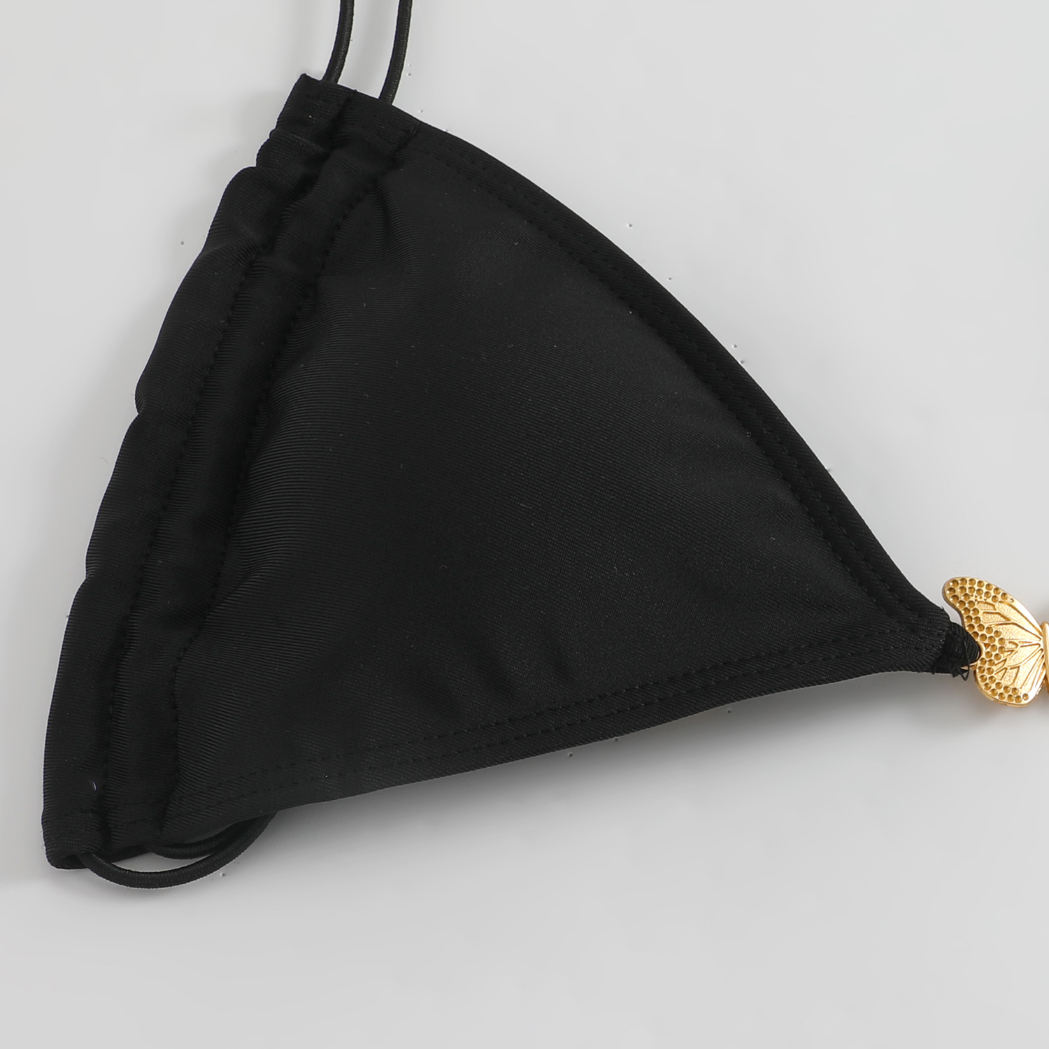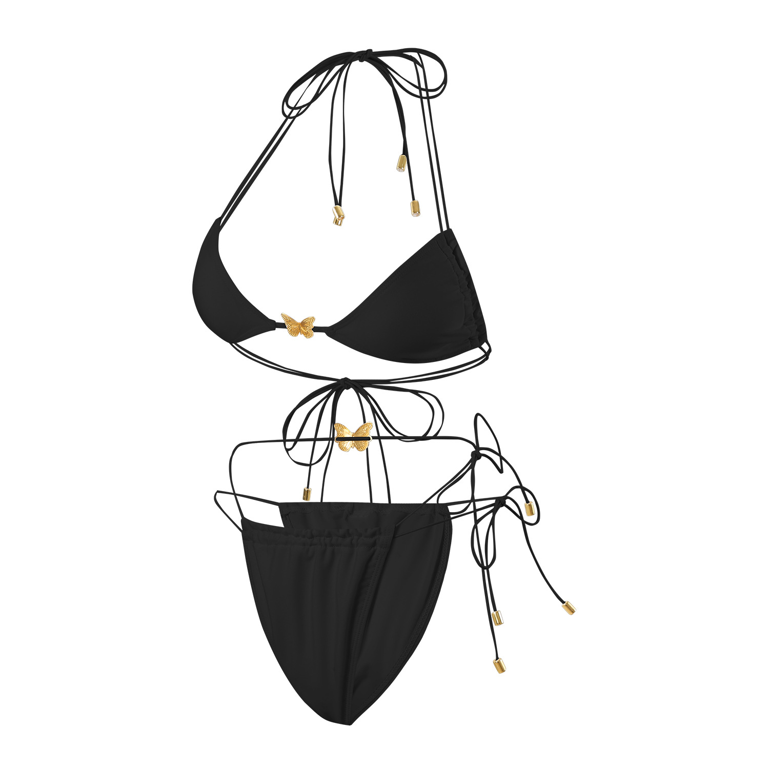 This solid black bikini combines a halter-neck triangle top with an elastic string construction for an adjustable, secure fit. A small butterfly ornament sits at the center of the top, adding a subtle decorative detail. The bottom features a minimal-coverage, string-tie design with bead accents on the sides, delivering a boho vacation look. Made from polyester, the set is durable and quick-drying, suitable for swimming and sunbathing during summer trips.