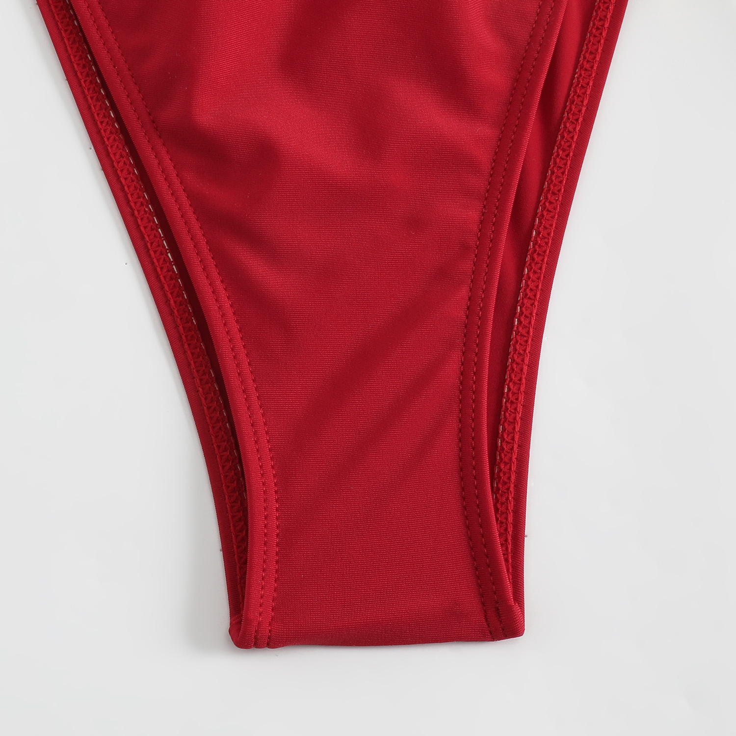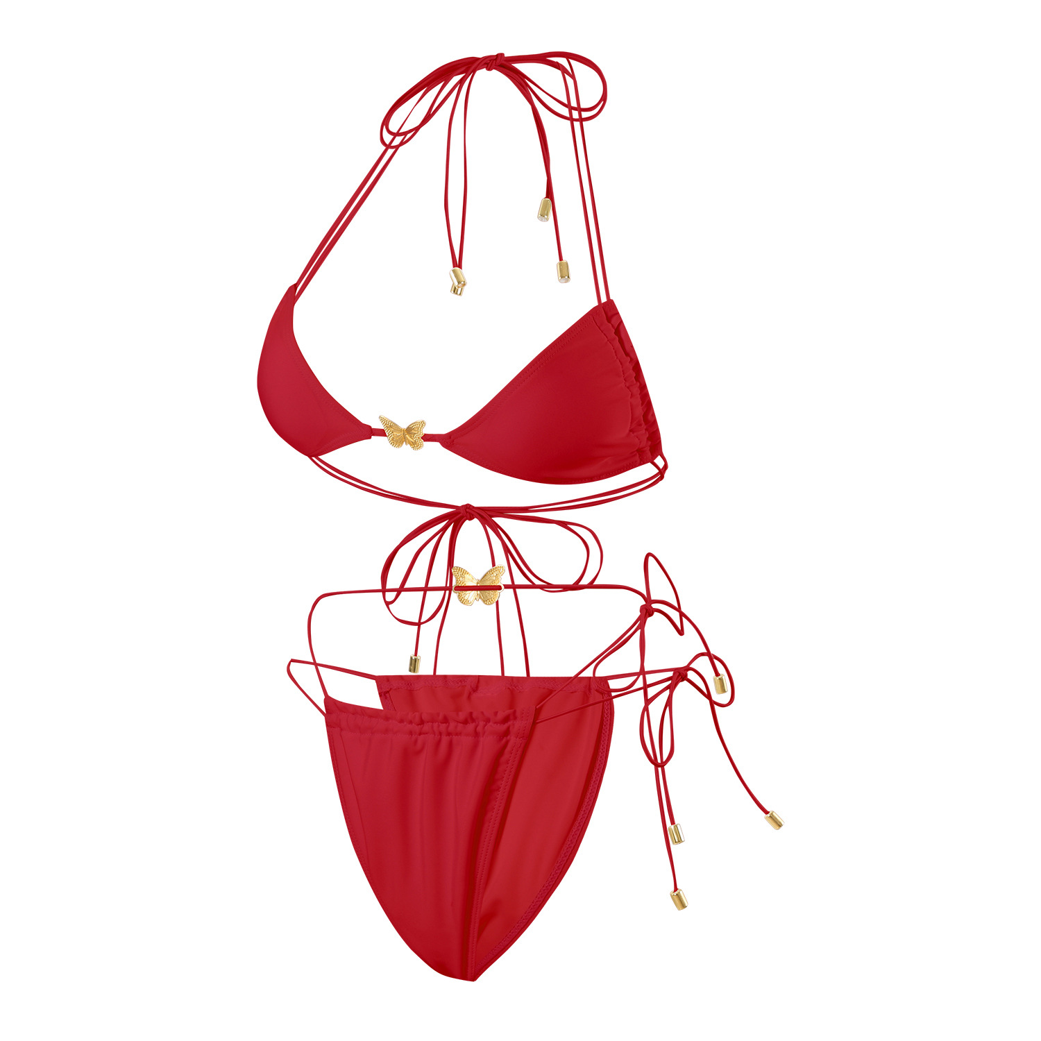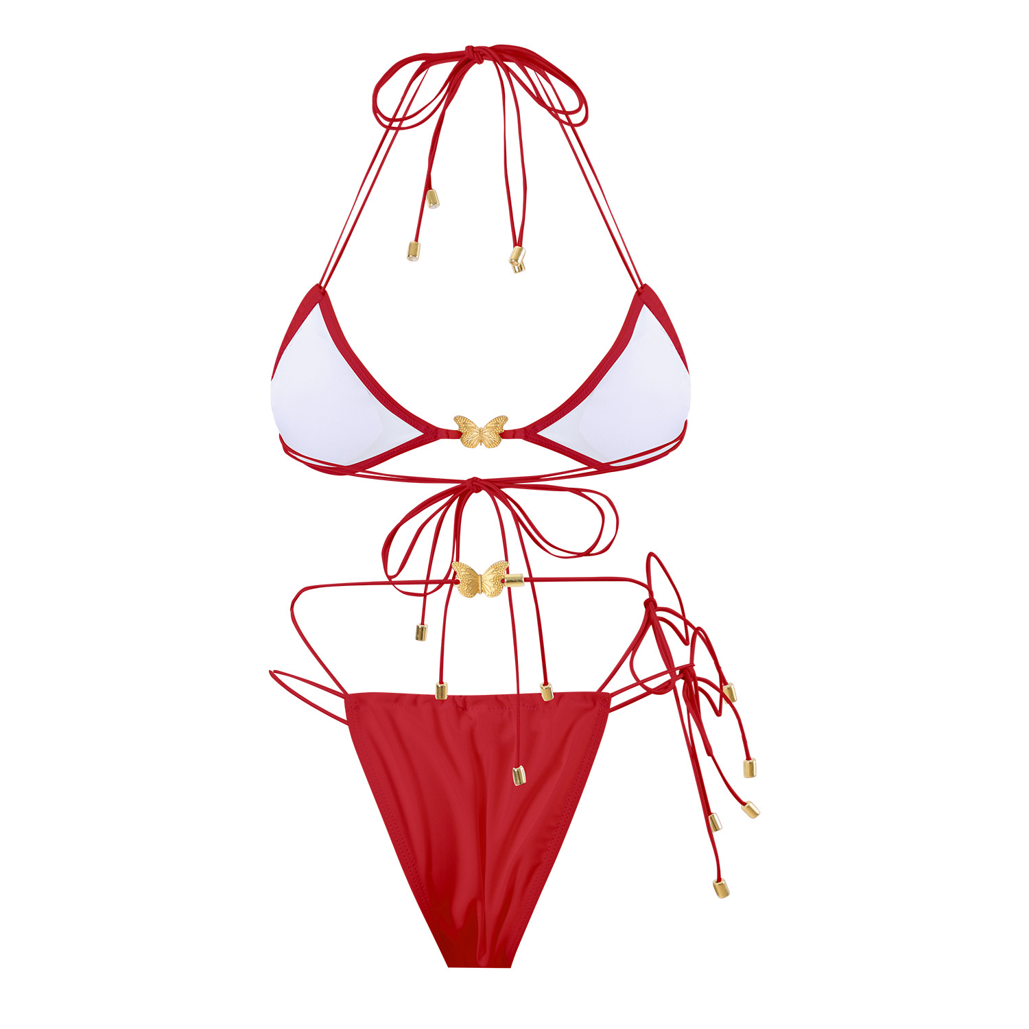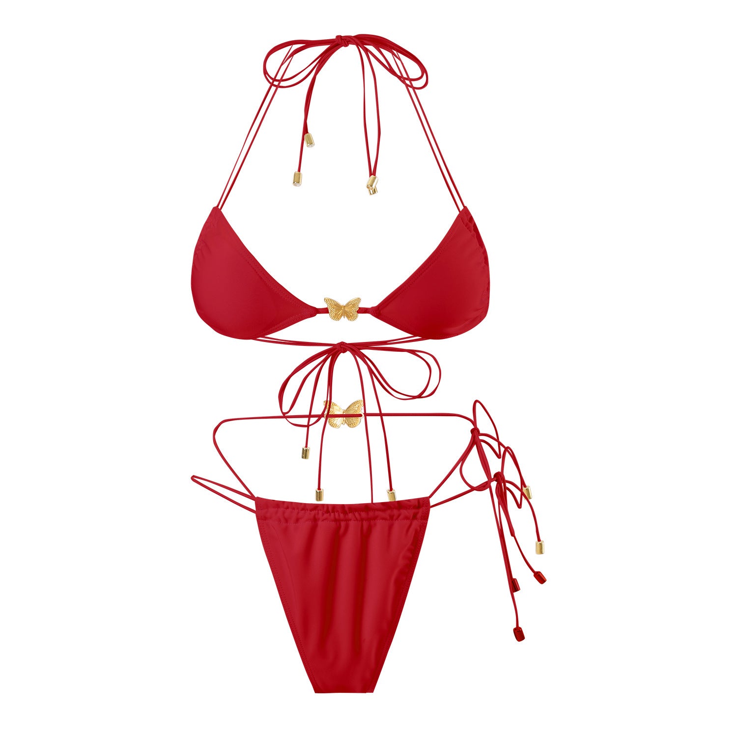 This solid black bikini combines a halter-neck triangle top with an elastic string construction for an adjustable, secure fit. A small butterfly ornament sits at the center of the top, adding a subtle decorative detail. The bottom features a minimal-coverage, string-tie design with bead accents on the sides, delivering a boho vacation look. Made from polyester, the set is durable and quick-drying, suitable for swimming and sunbathing during summer trips.