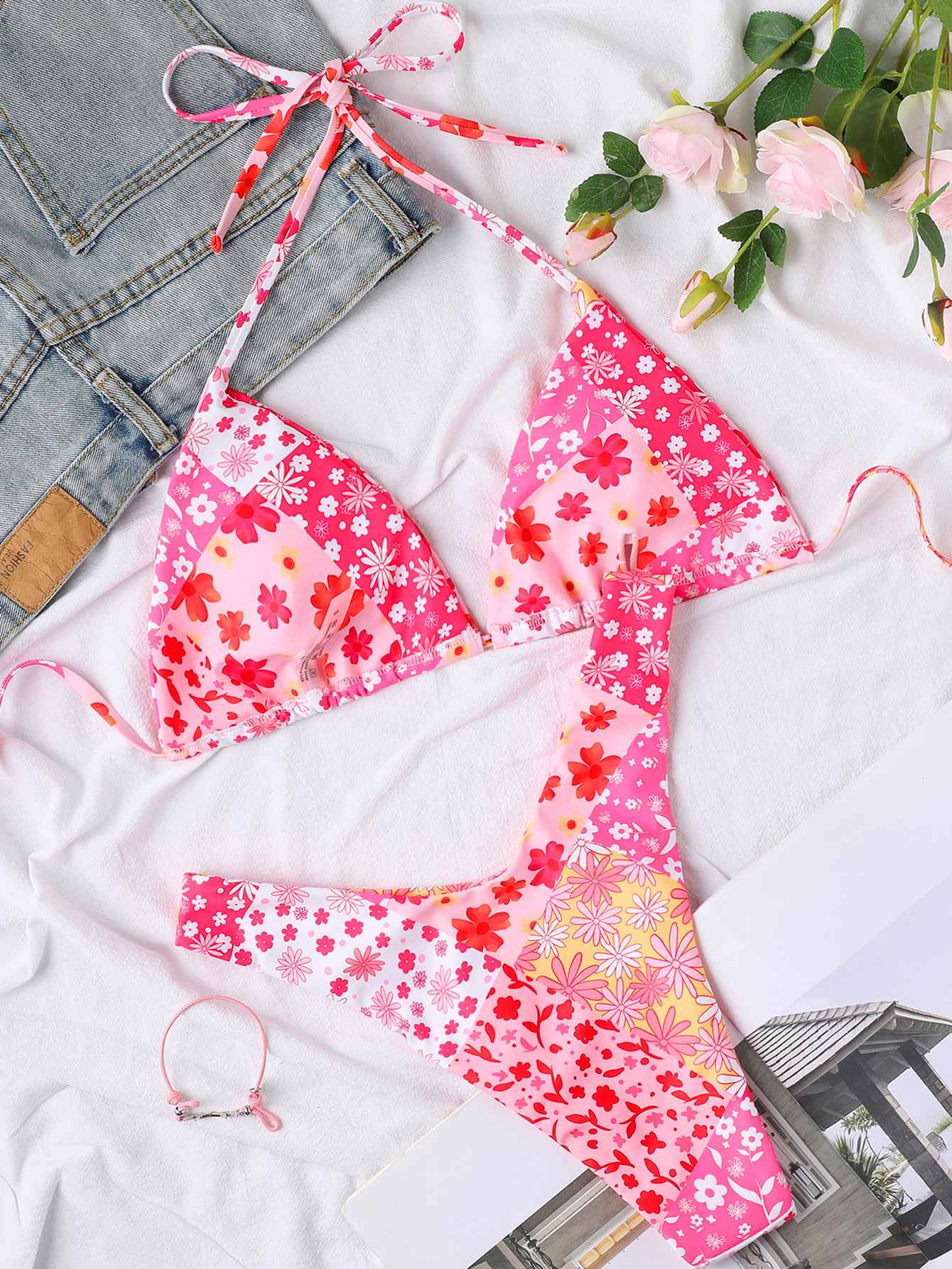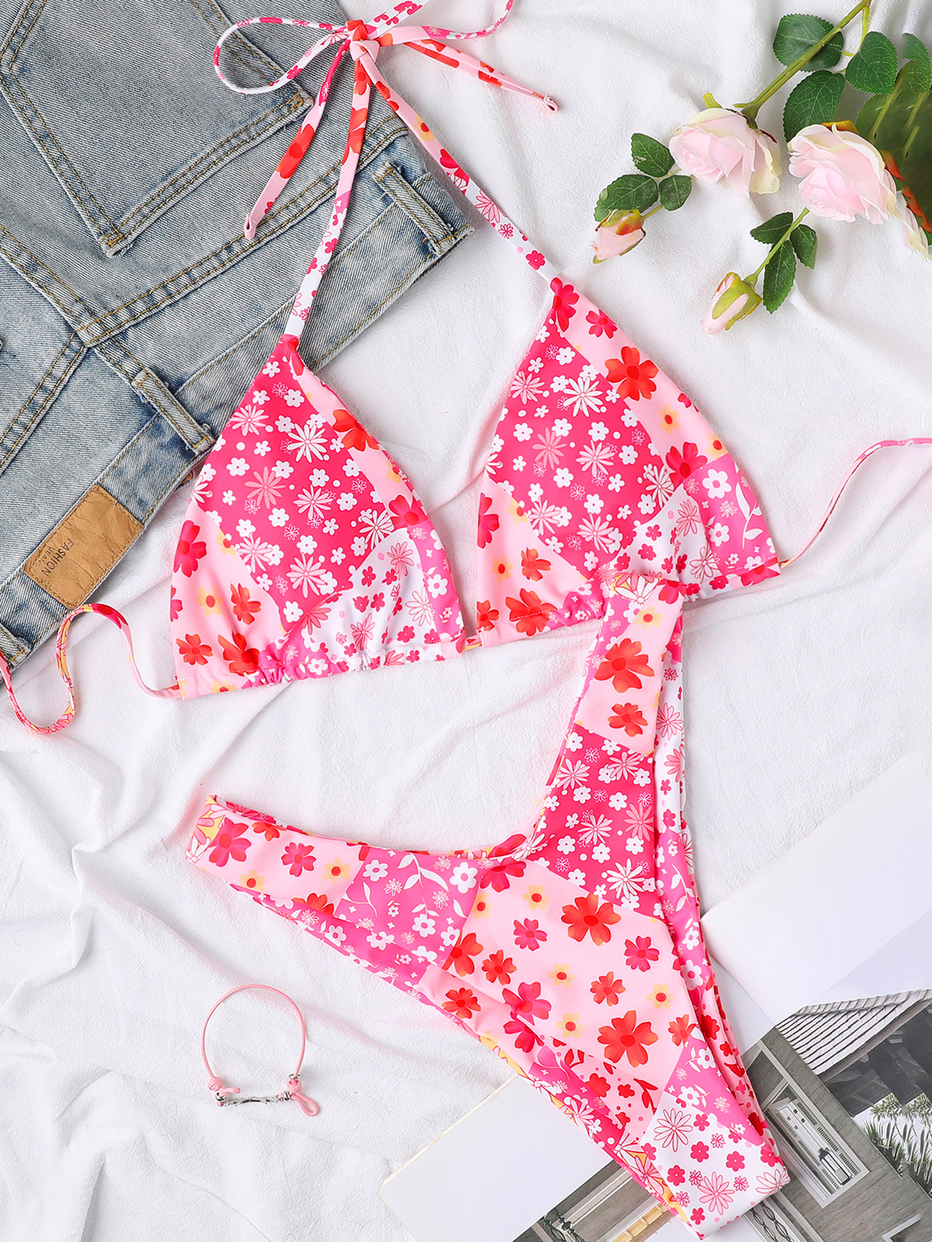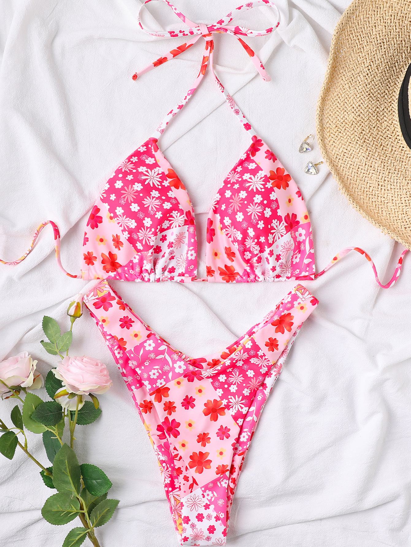 Bikini Floral Tie Neck Triangle Cup Sexy Bikini Split Swimwear Swimsuit Women