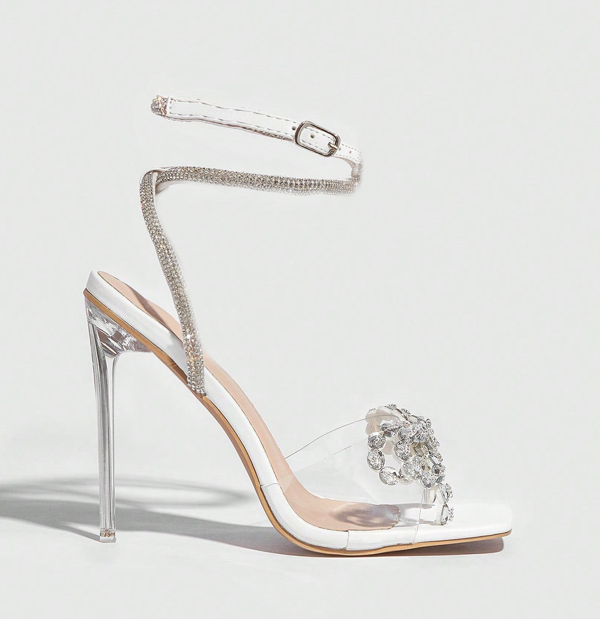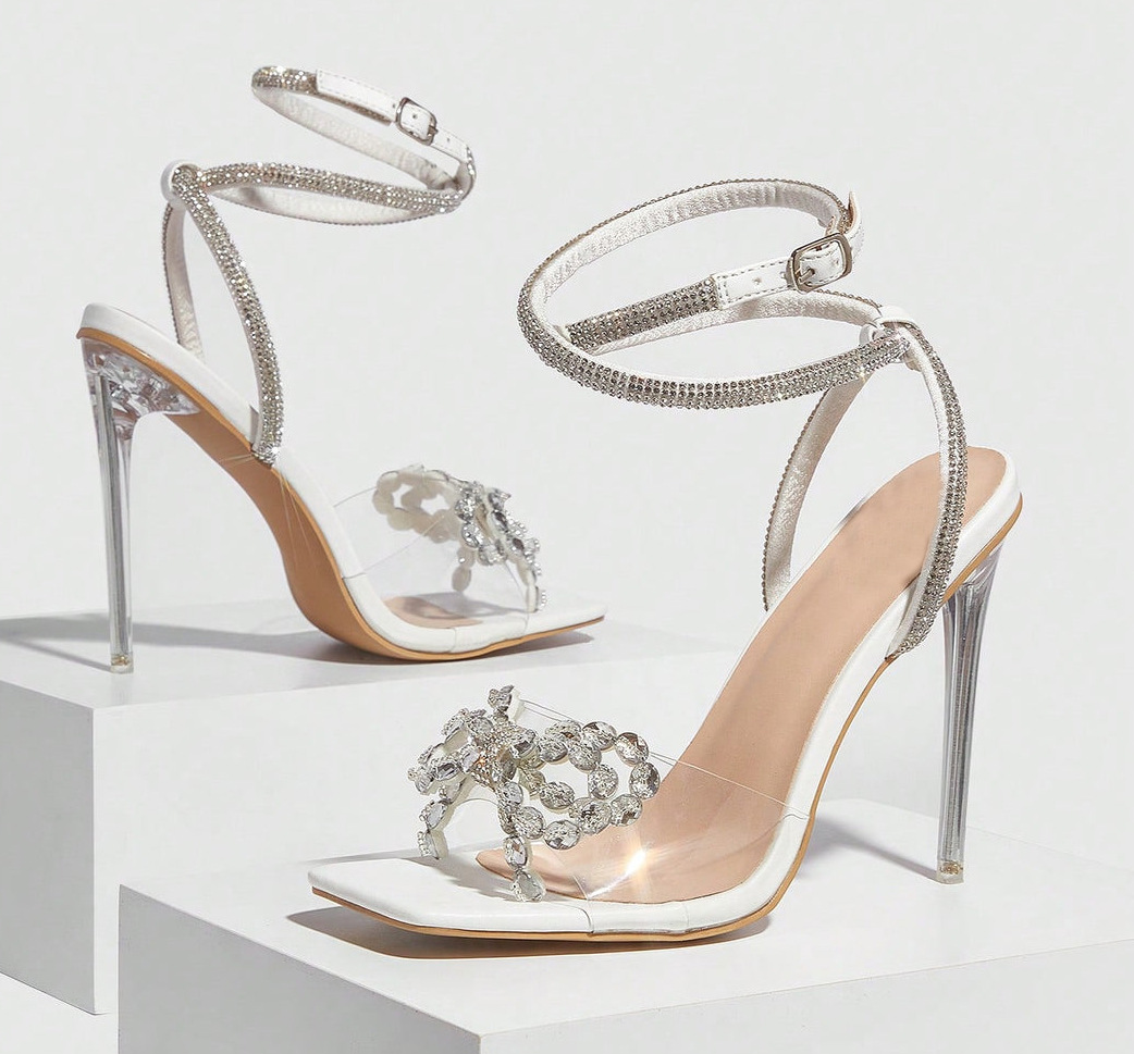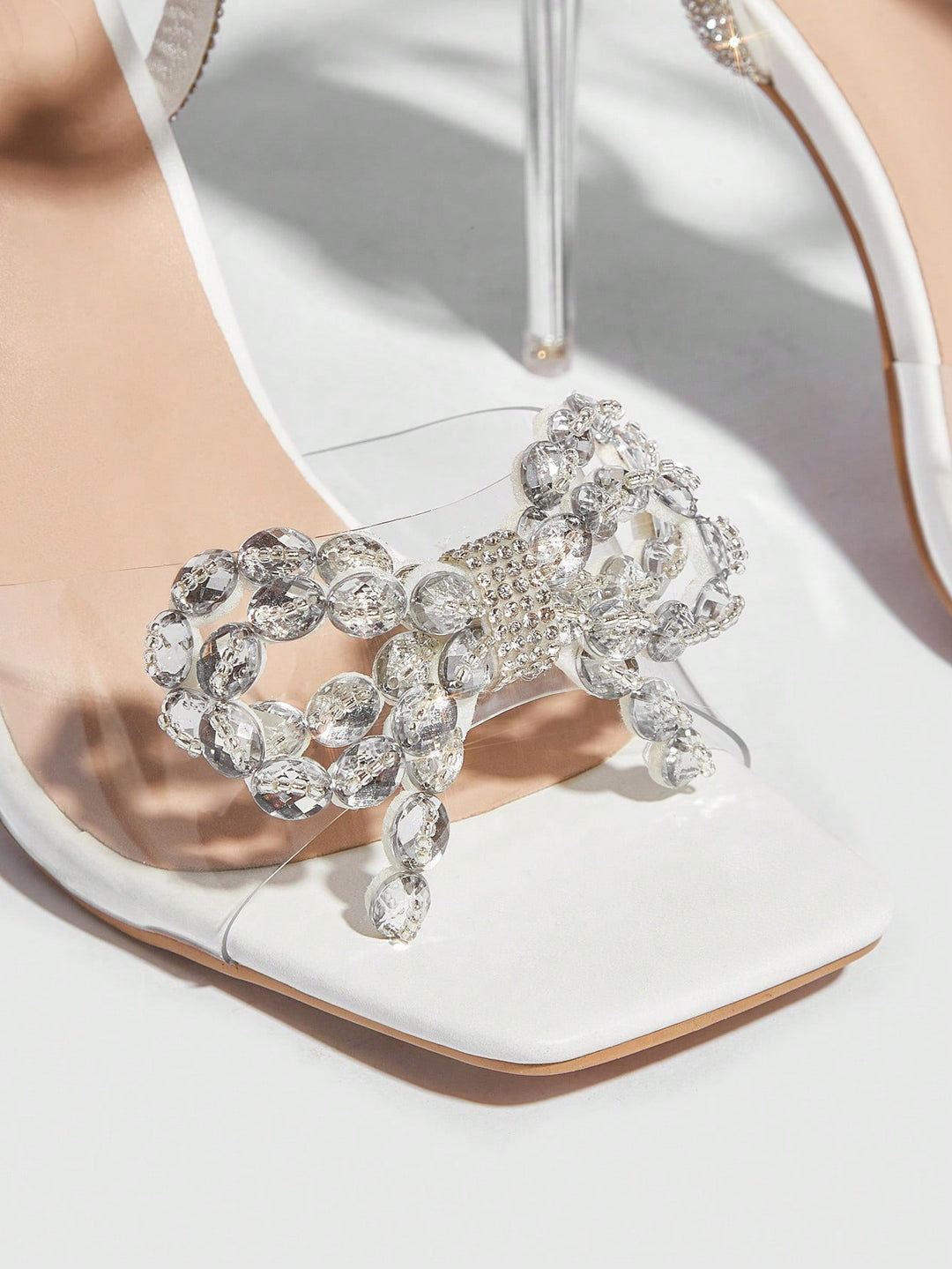 High Heel Sandals Women Heels Rhinestone Bow 11cm Stiletto Heel Square Toe Rhinestone Clear Heel Women
