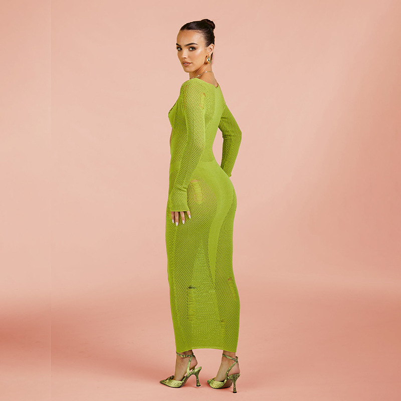 This lime green, solid-color maxi dress combines a boho-inspired silhouette with sun-protective coverage. The long sleeves provide modesty and warmth on breezy days, while the waist cut-out adds a contemporary touch. Made from jersey fabric with a polyester composition, the piece offers a soft, stretchable fit suitable for beachwear, resort vacations, and daytime outings.