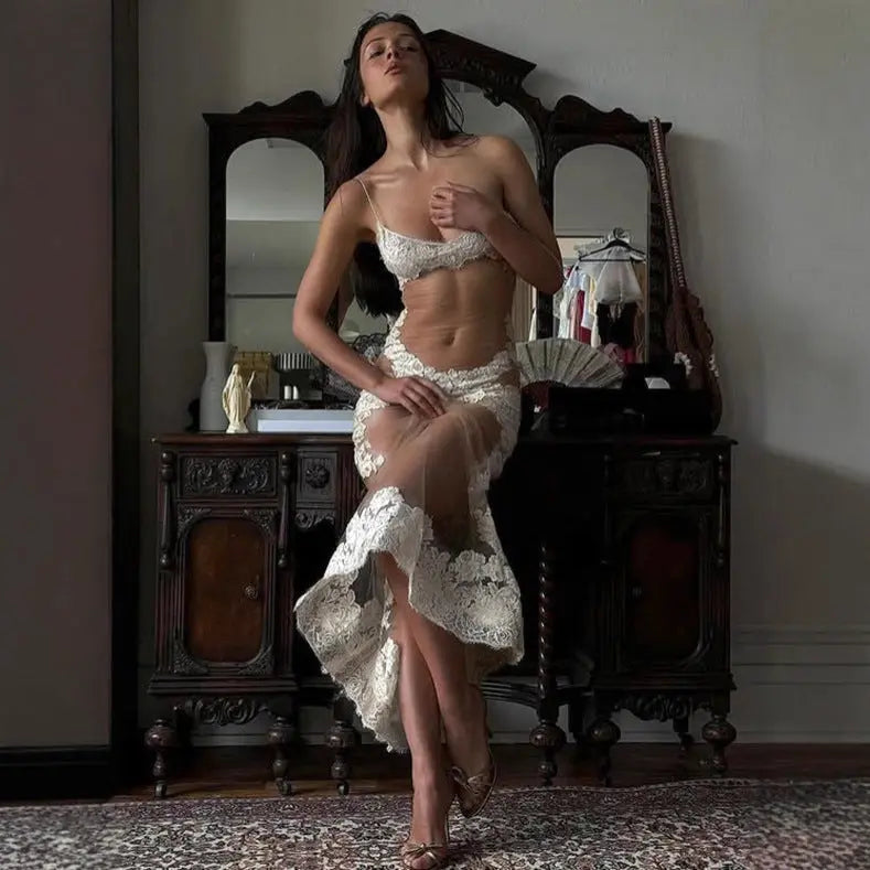 Sexy Summer Women Mesh Lace Spaghetti Strap Maxi Dress See Through Nightdress Bella Mia