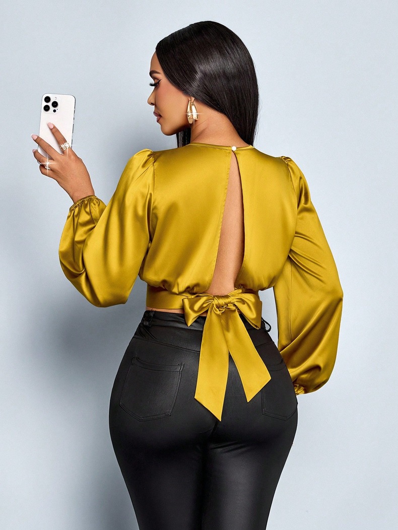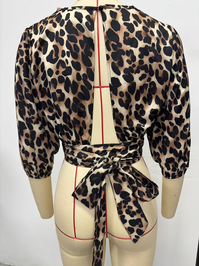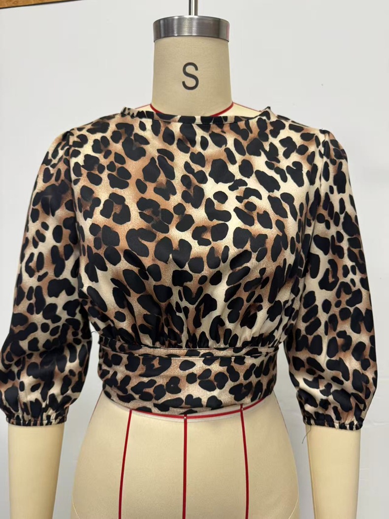 Leopard Print Satin Cropped Blouse Women Backless Sexy Ruched Tie Top Bella Mia