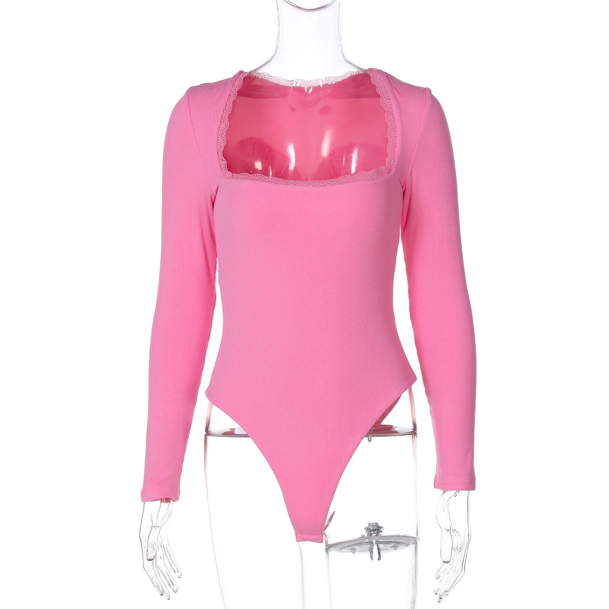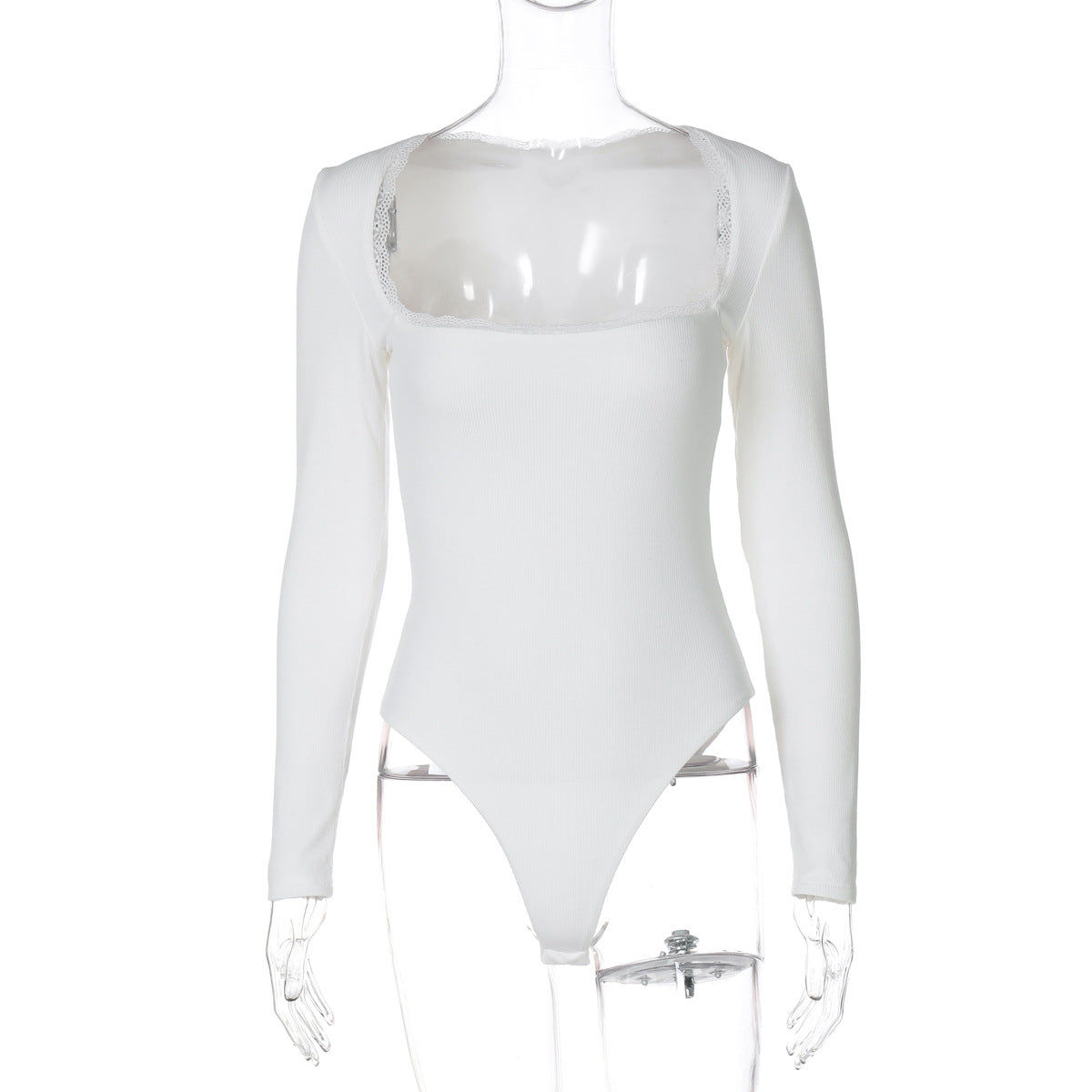 Women Clothing Winter Sexy Square Neck Lace Slim Fit Base Long Sleeve Jumpsuit