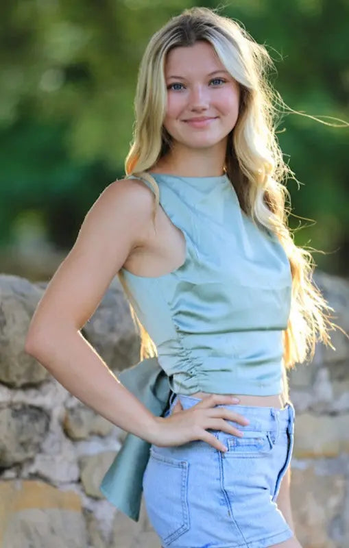 Satin Sleeveless Backless Top With Open Back And Asymmetric Draped Neckline Miss Sparkling