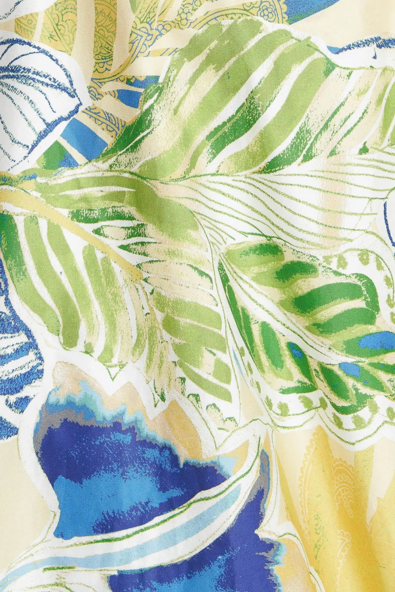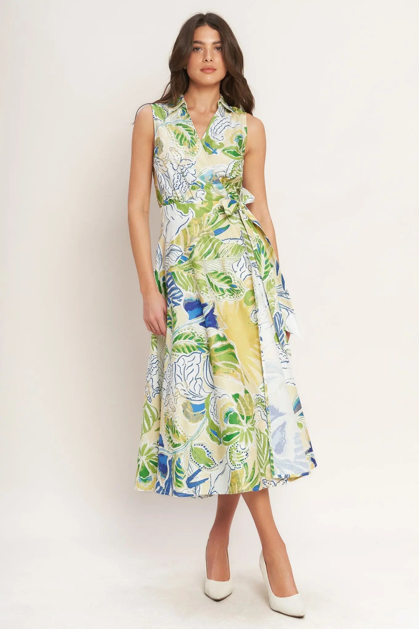 A printed woven midi dress featuring collar, surplice neckline, sleeveless, true wrap and side tie