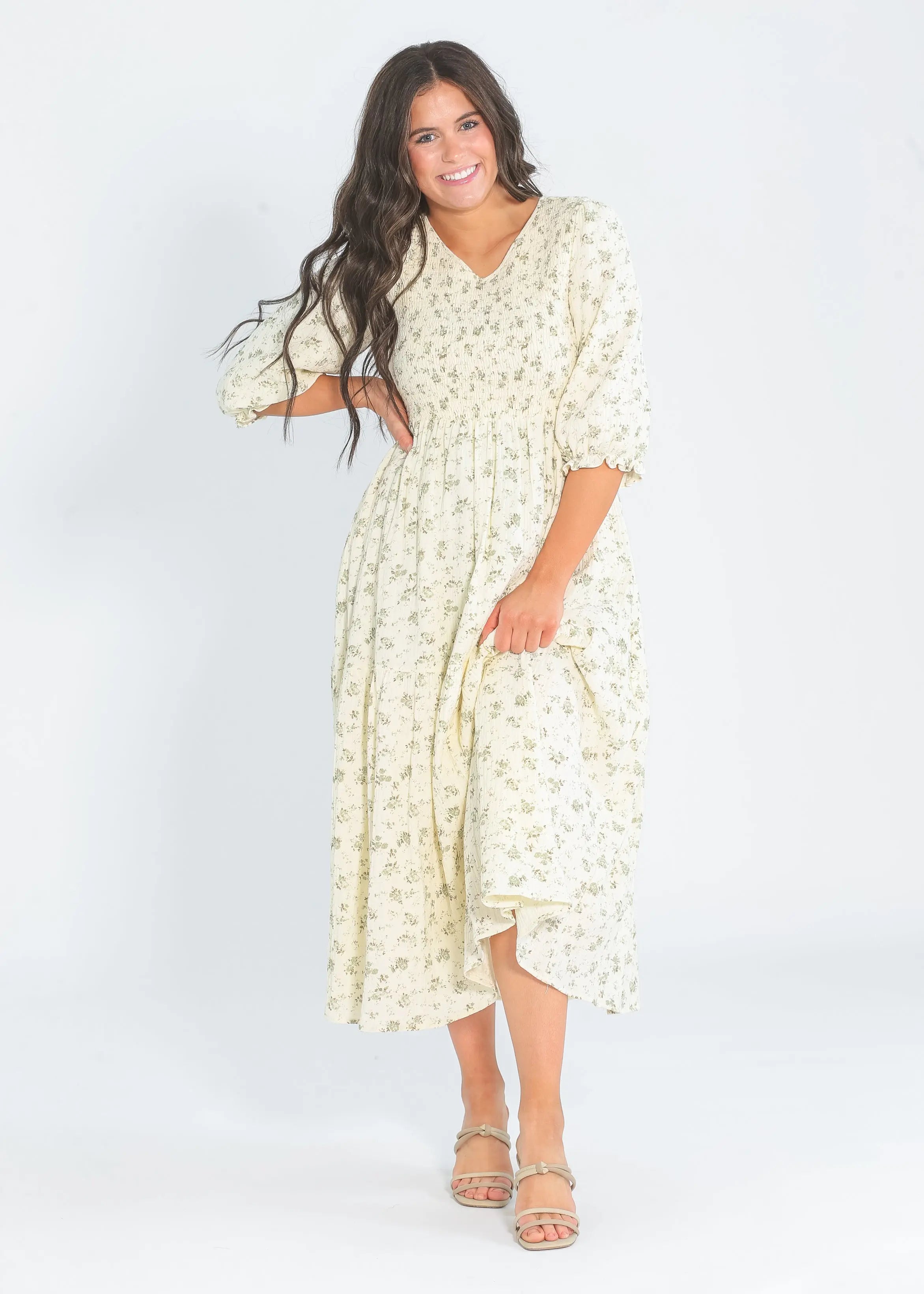 The Flora 3/4 Sleeve Smocked Olive Floral Midi Dress is an Inherit Design made from 100% cotton with a unique olive floral print. Featuring a modest v-neckline, smocked bodice, and puff sleeves, it offers a flattering, flowy fit. This timeless midi is perfect for church, family gatherings, or everyday wear—easy to dress up or down for any occasion!