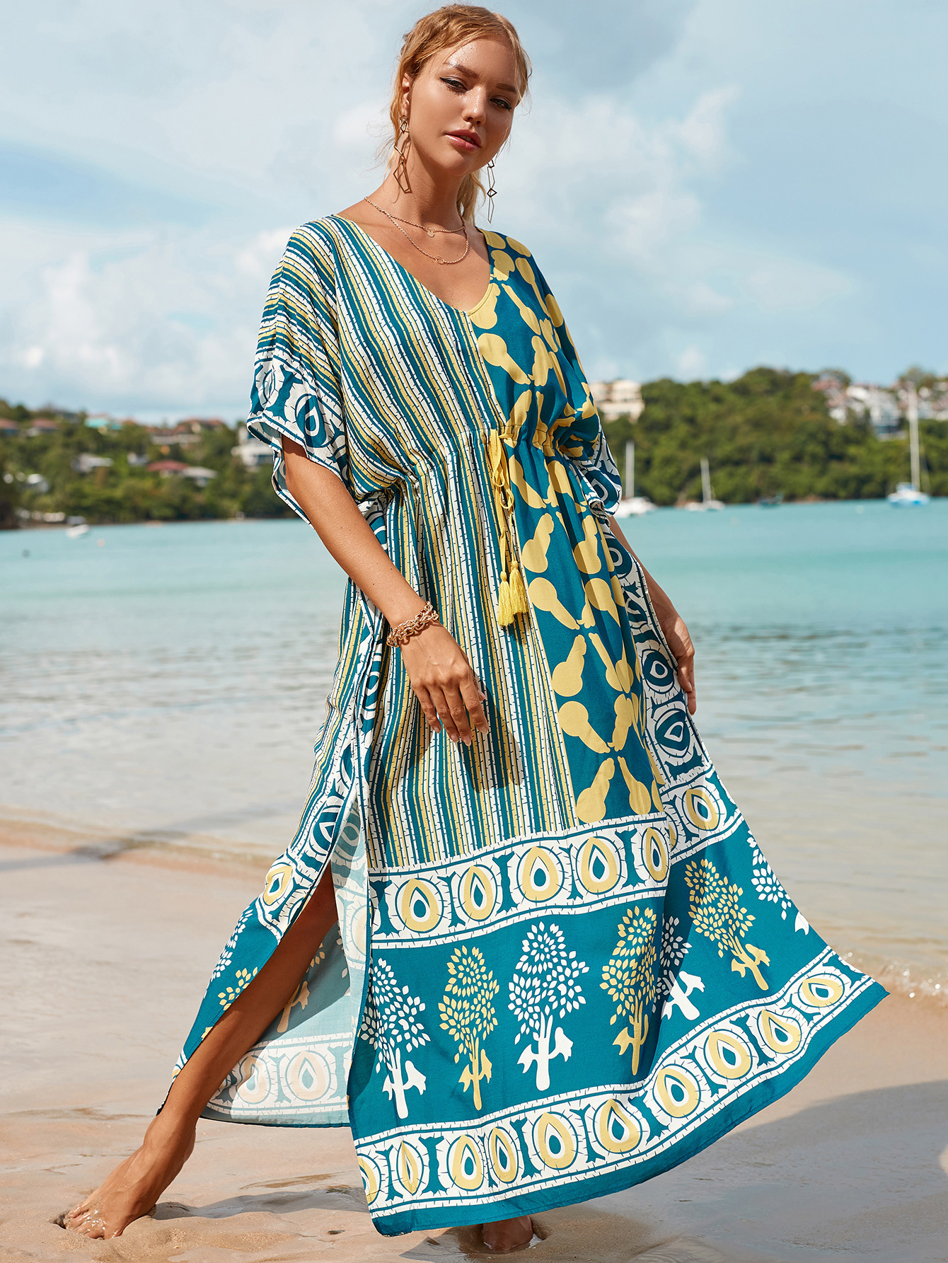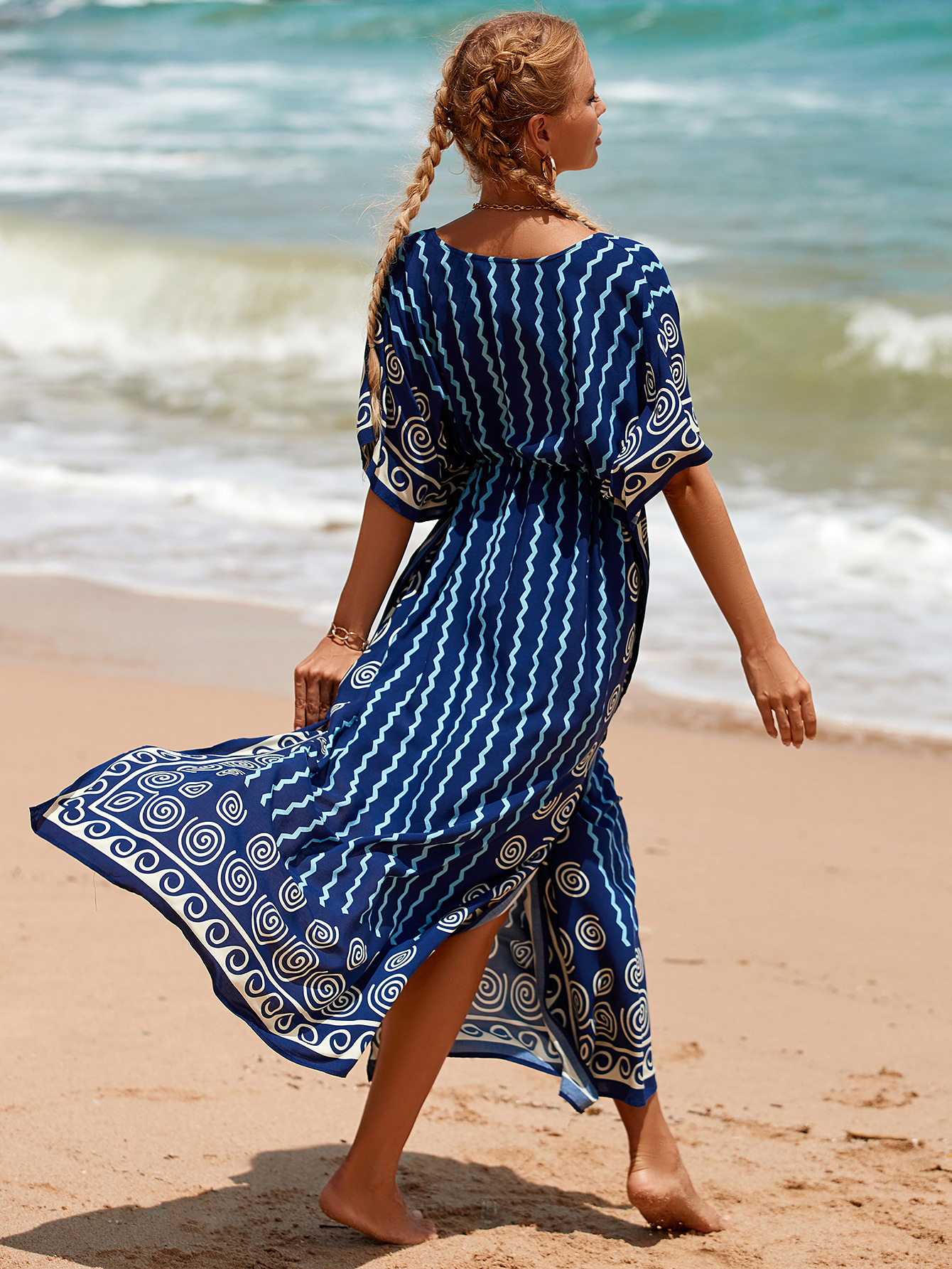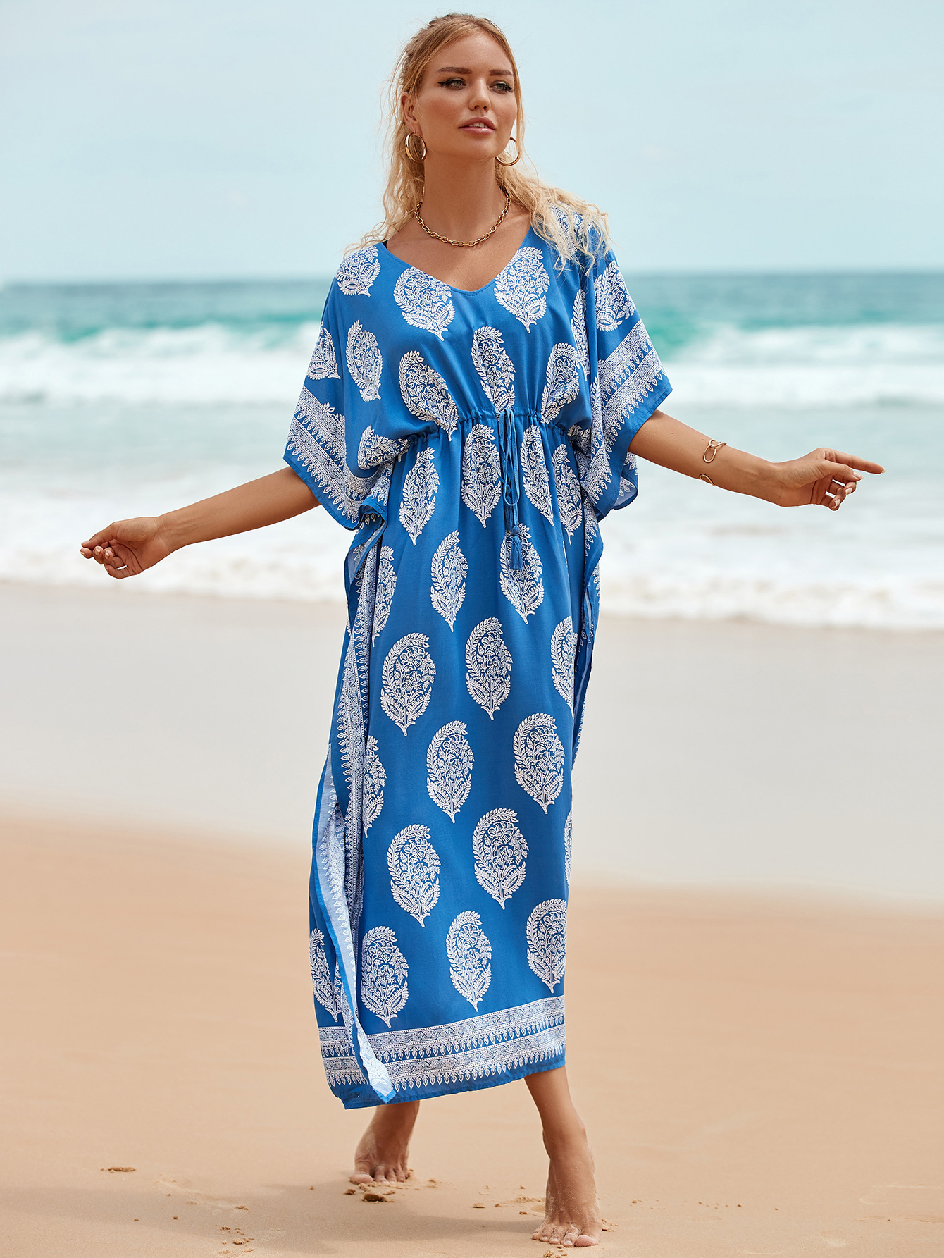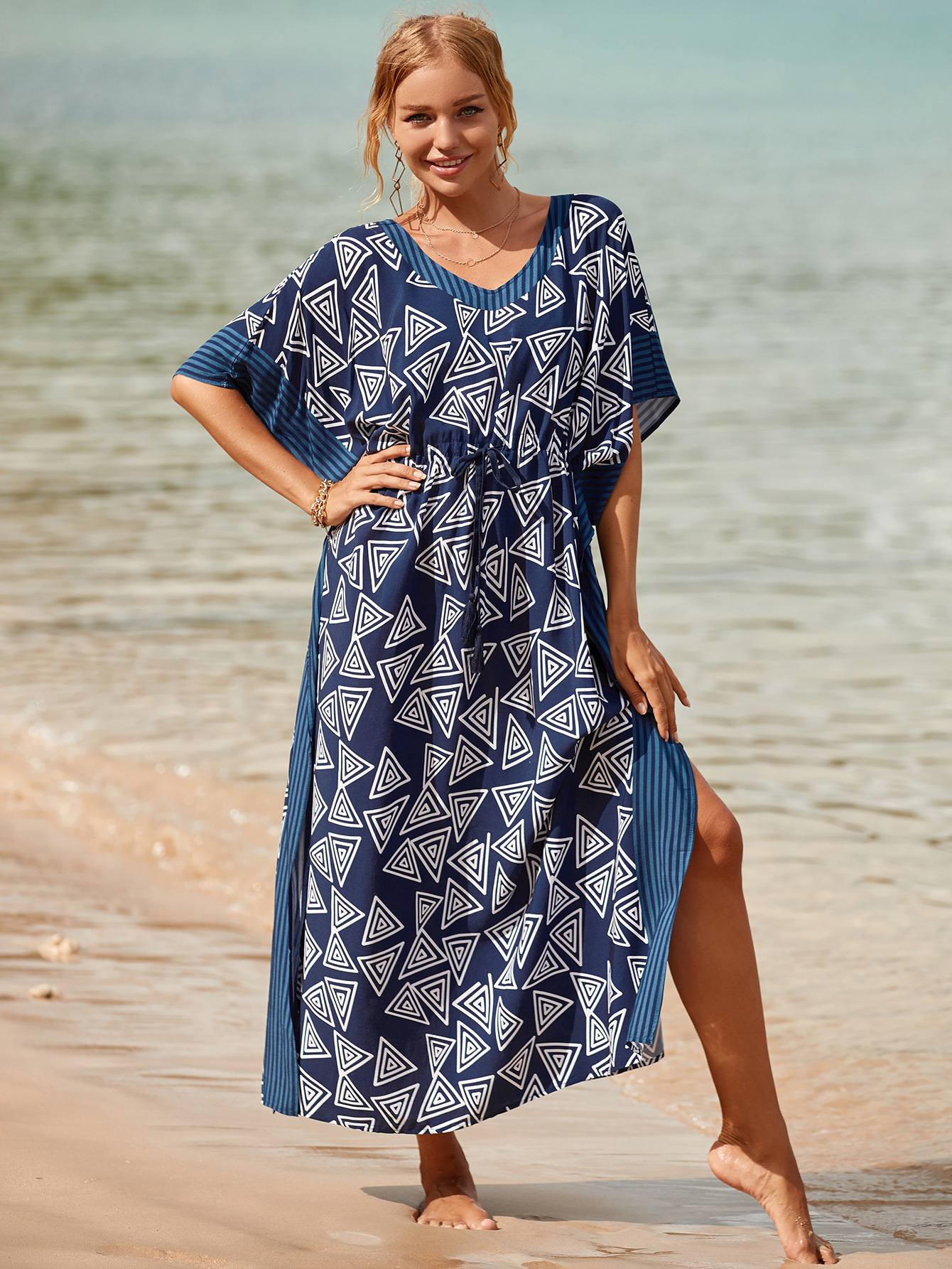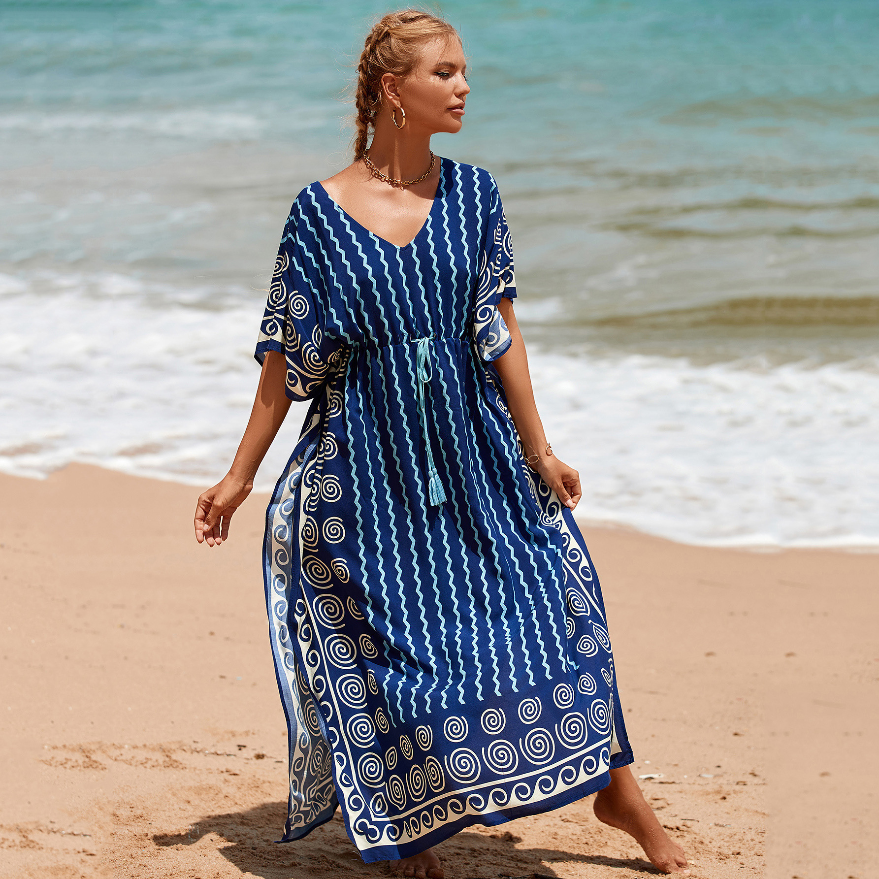Printed Pull Belt Robe Vacation Casual Beach Bikini Cover