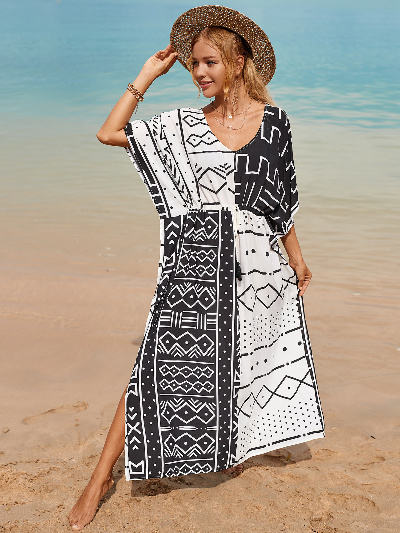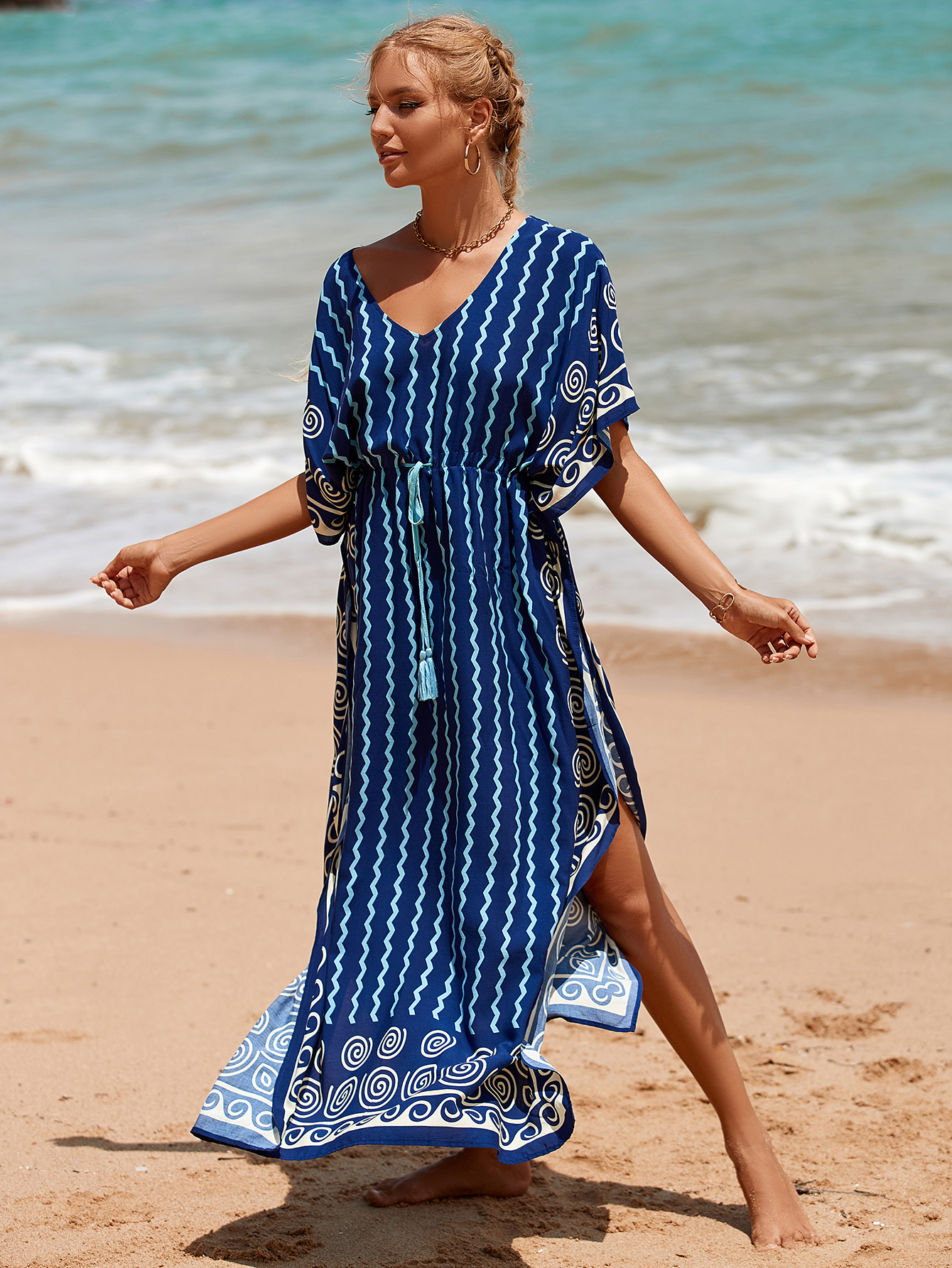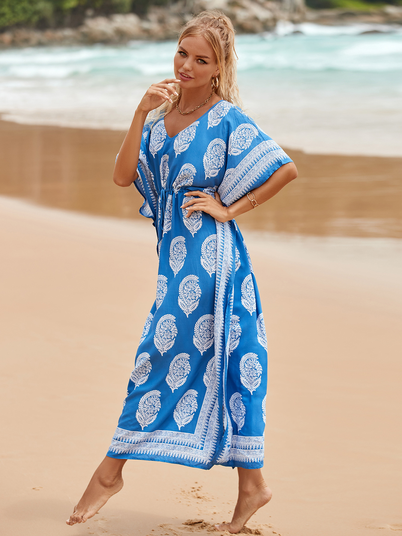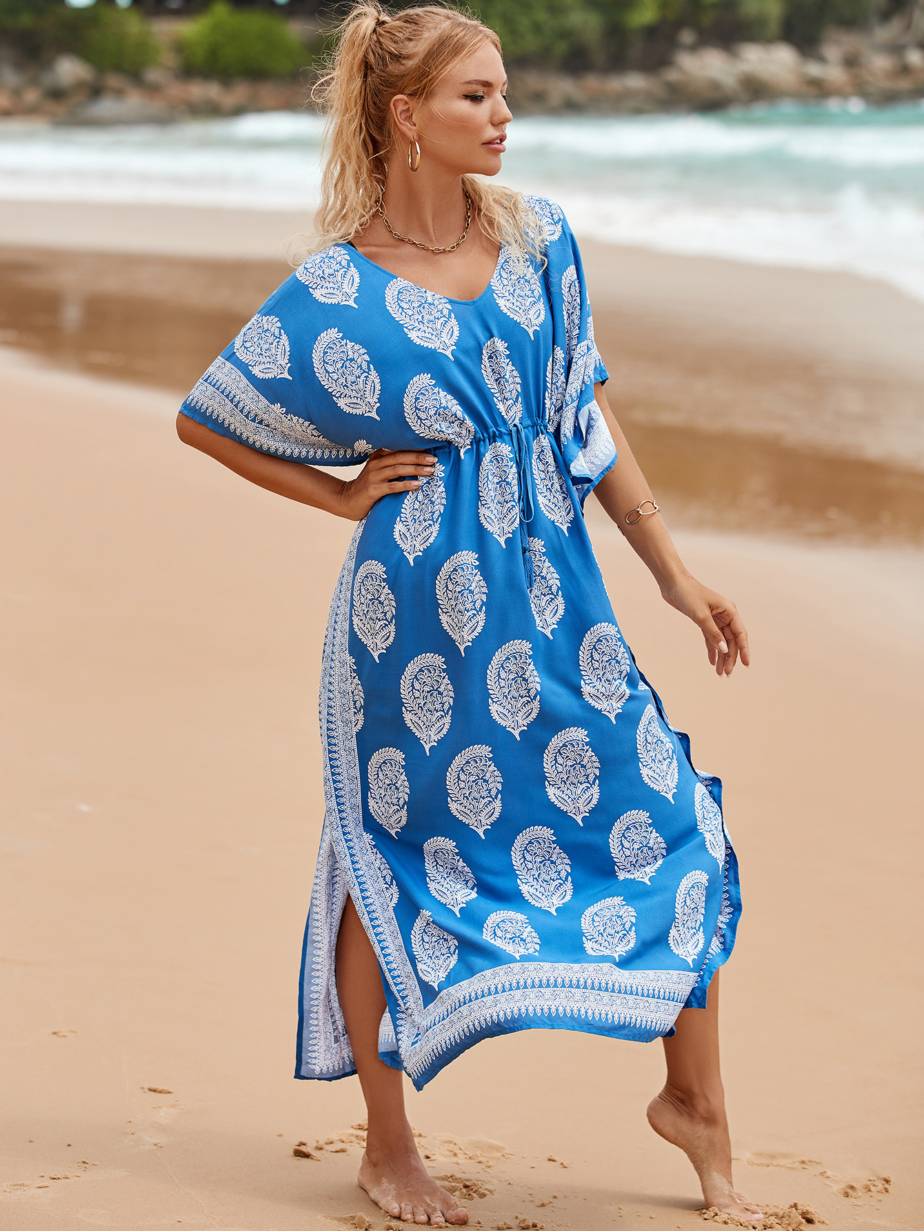 Printed Pull Belt Robe Vacation Casual Beach Bikini Cover