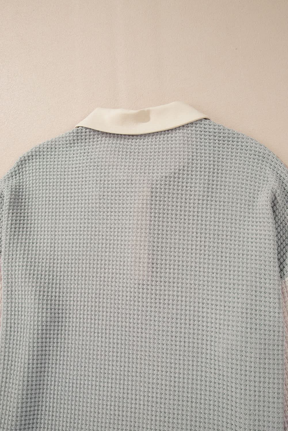 The garment features colorblock panels for a contemporary silhouette and a collared Henley neckline with a two-button placket, allowing the neckline to be worn open or closed. Long sleeves provide warmth without bulk, and the relaxed fit suits layered outfits and casual looks alike.