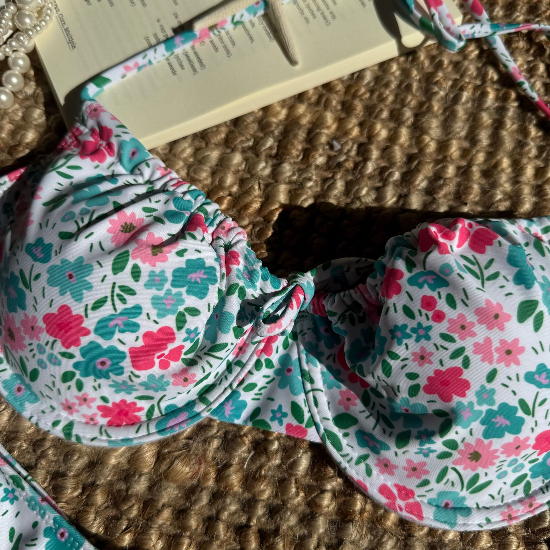 Designed for sun-soaked days, this floral bikini set blends boho charm with a modern silhouette. The halter-style top features a banded design with gathered cups and adjustable ties at the neck and back for a secure, personalized fit. The bottom offers a classic bikini cut with side ties for customizable coverage. The swimsuit is crafted from polyester fabric, providing quick-drying performance and durable color retention.