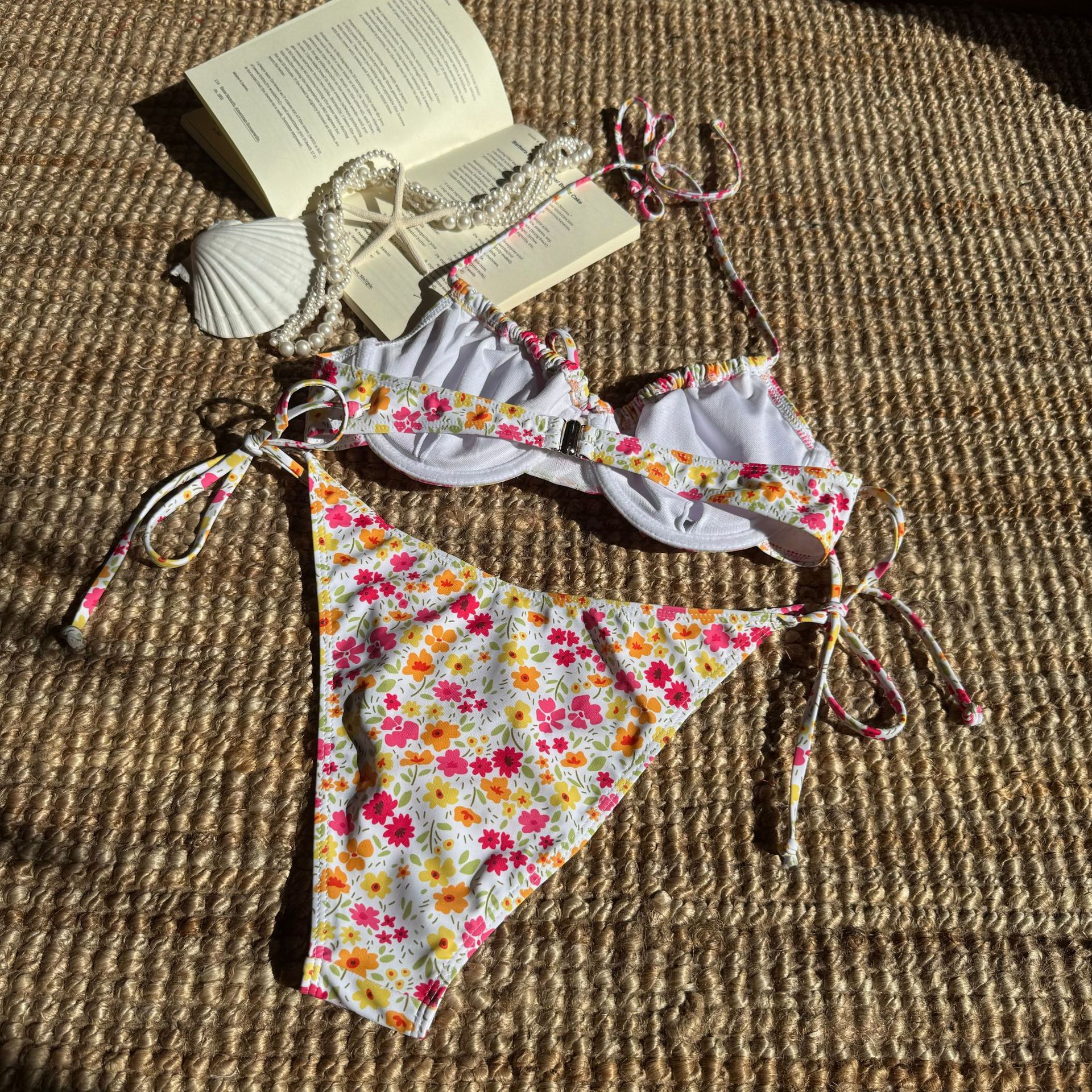 The print showcases pink, orange, and yellow flowers on a white base, creating a bright, versatile look for beach days, poolside lounging, or tropical getaways. Made for standard swimwear sizing, the ties at the sides and neck help tailor the fit to different body shapes, delivering comfort and confidence in summer activities. Style notes reflect a boho and vacation vibe, making this set a practical choice for sunny seasons.
