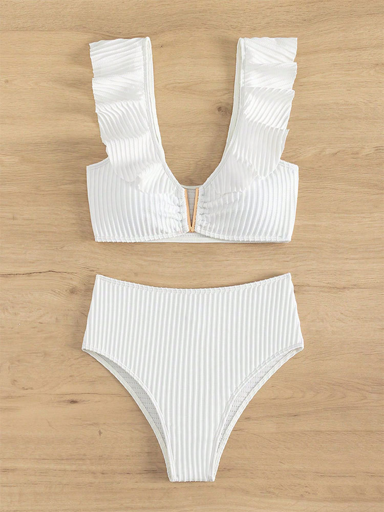 High Waist Swimsuit Sexy Solid Color Ruffles V Neck Beach Vacation Bikini Ladies