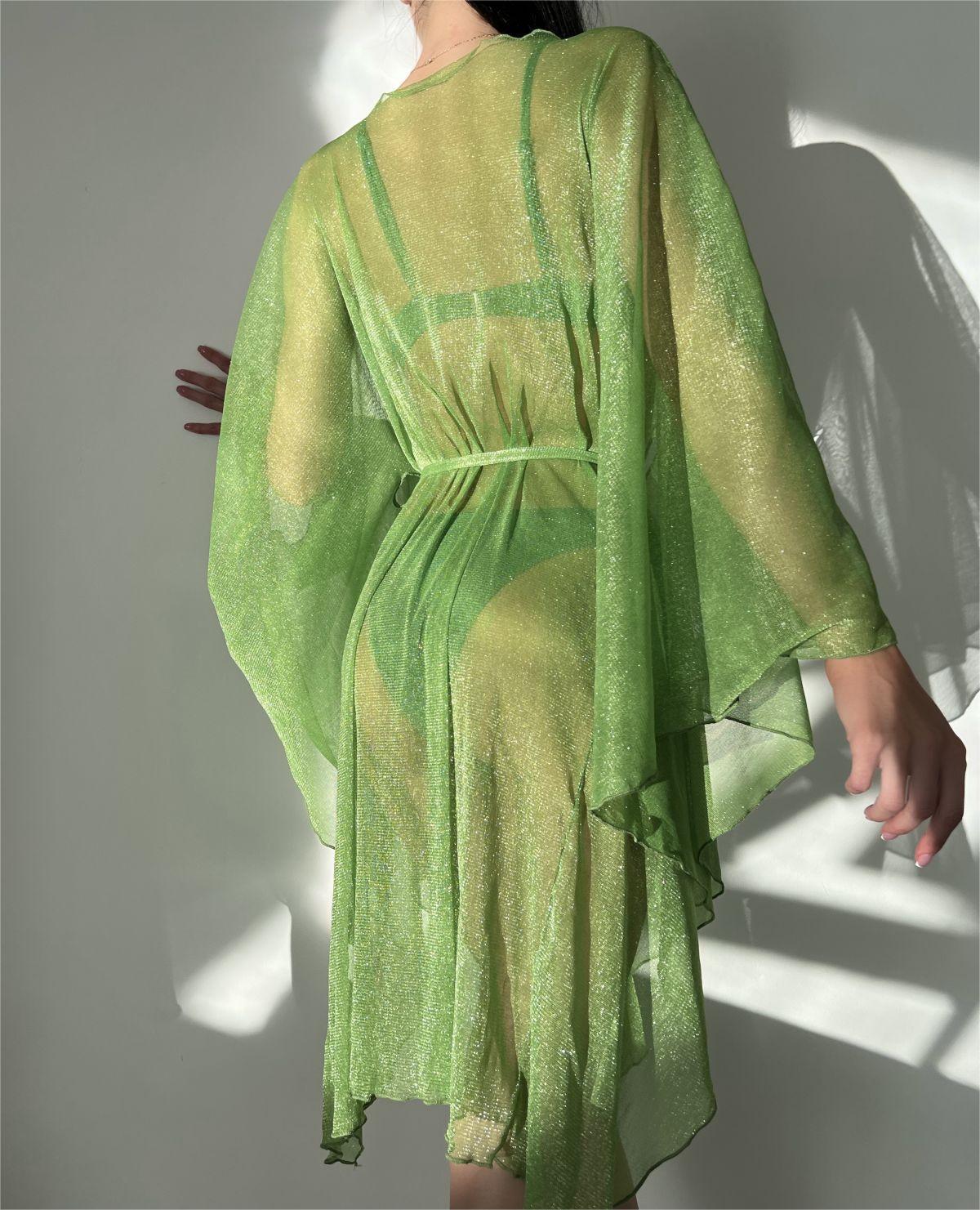 Lightweight nylon fabric with a subtle shimmer provides a carefree, resort-ready silhouette. This green, sheer cover-up features a deep V neckline and a long, kimono-style sleeve design for a breezy, casual look. A matching belt at the waist cinches for a defined shape while preserving a relaxed fit.