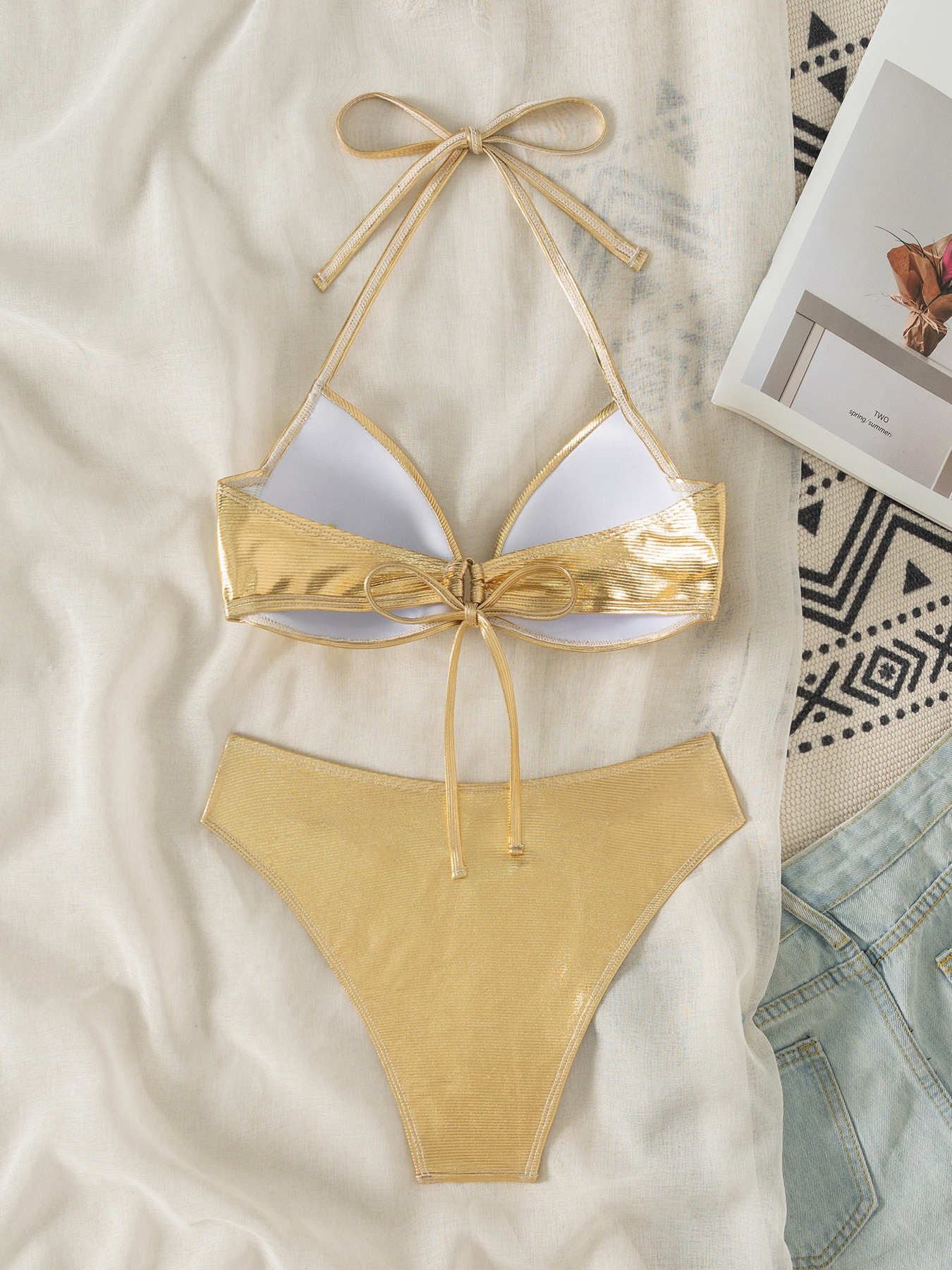 Sexy Halter Swimsuit Solid Color Hard Bag Split Bikini Swimsuit