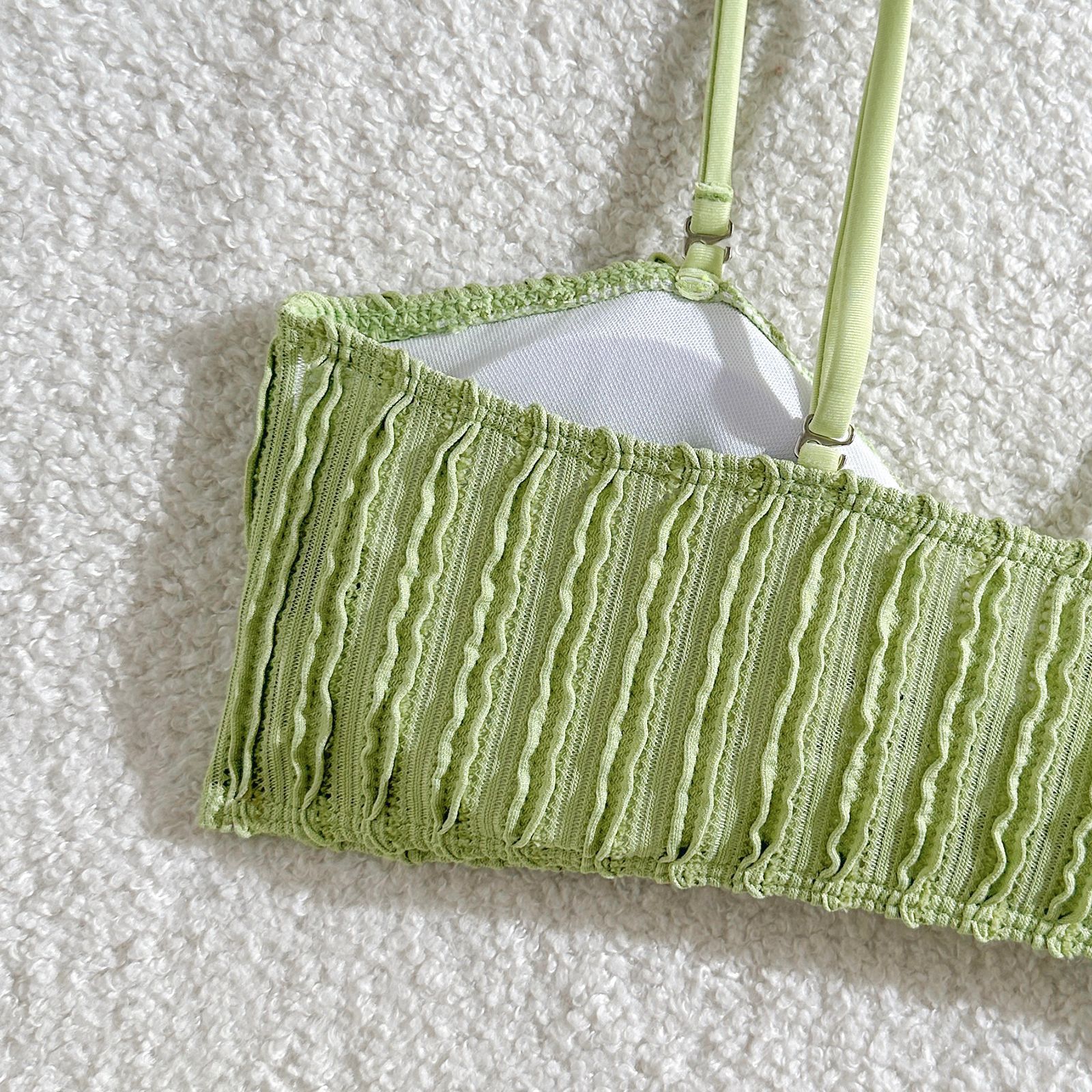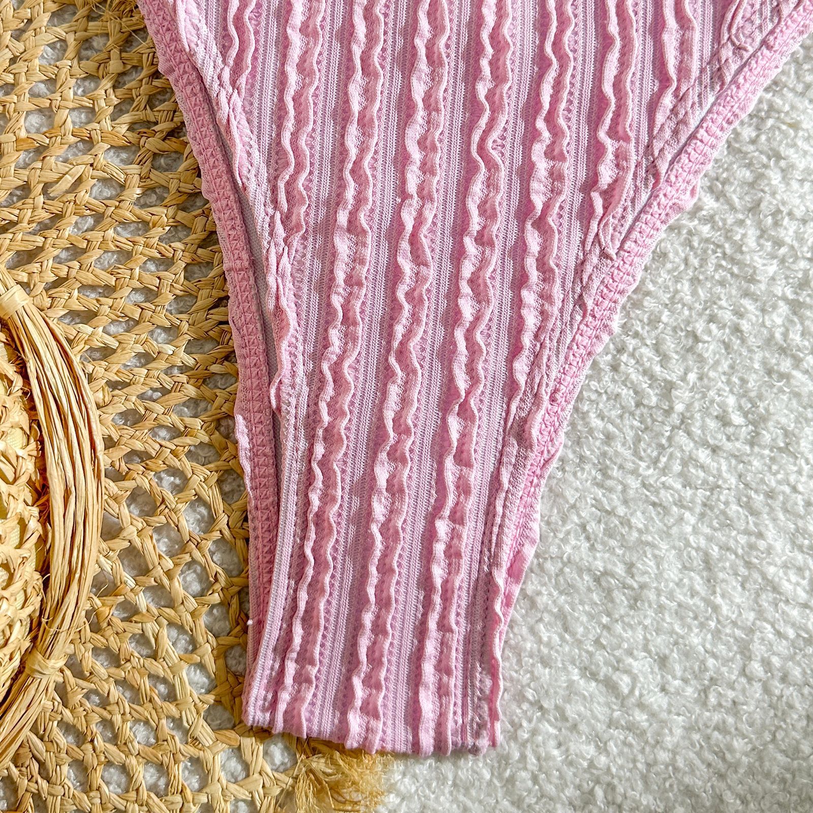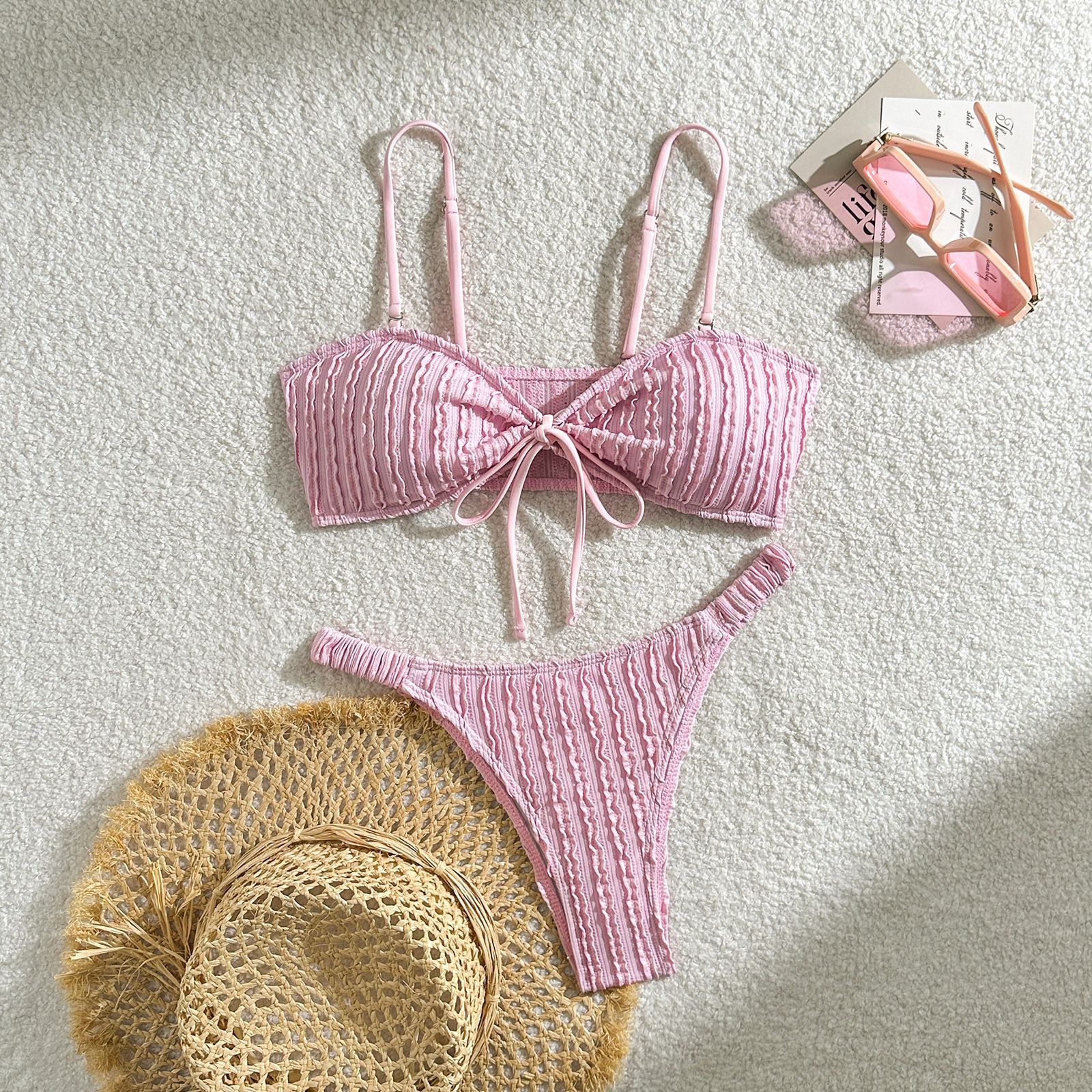 Careful stitching and a textured finish provide durability for poolside use, while the tie closure at the front offers adjustable coverage. The set is designed for summer or tropical vacations, with a comfortable fit that moves with you.
