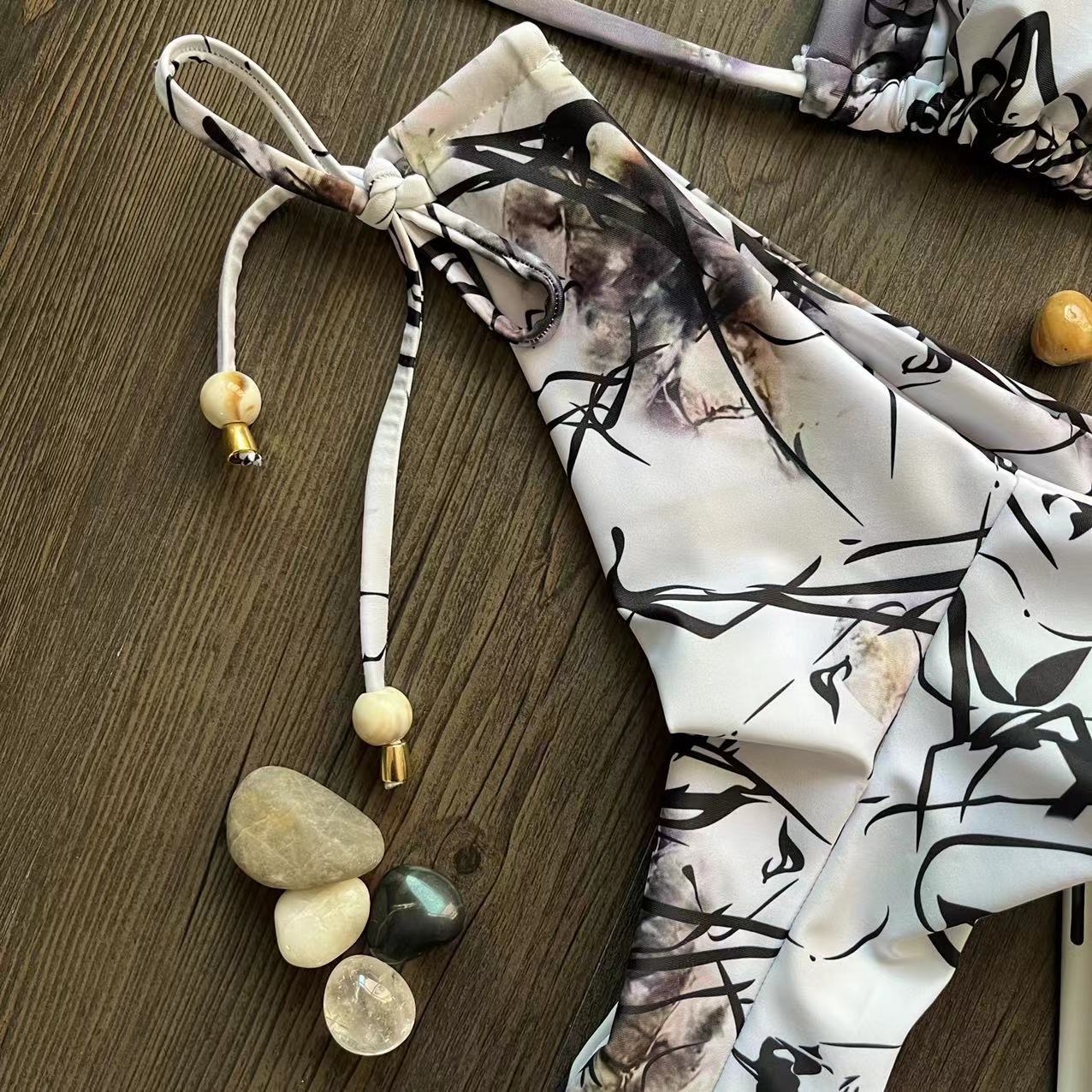 Step into summer with this printed split bikini, crafted in a Boho & Vacation style. Made from polyester for durability and quick-drying comfort, the suit offers a flattering silhouette with a halter strap top and tie-side bottoms. The halter neckline adjusts for secure support, while the split bottom design allows freedom of movement. The all-over floral-printed pattern blends soft neutrals with bold lines for an ethnic-inspired look that remains versatile at the beach or by the pool.