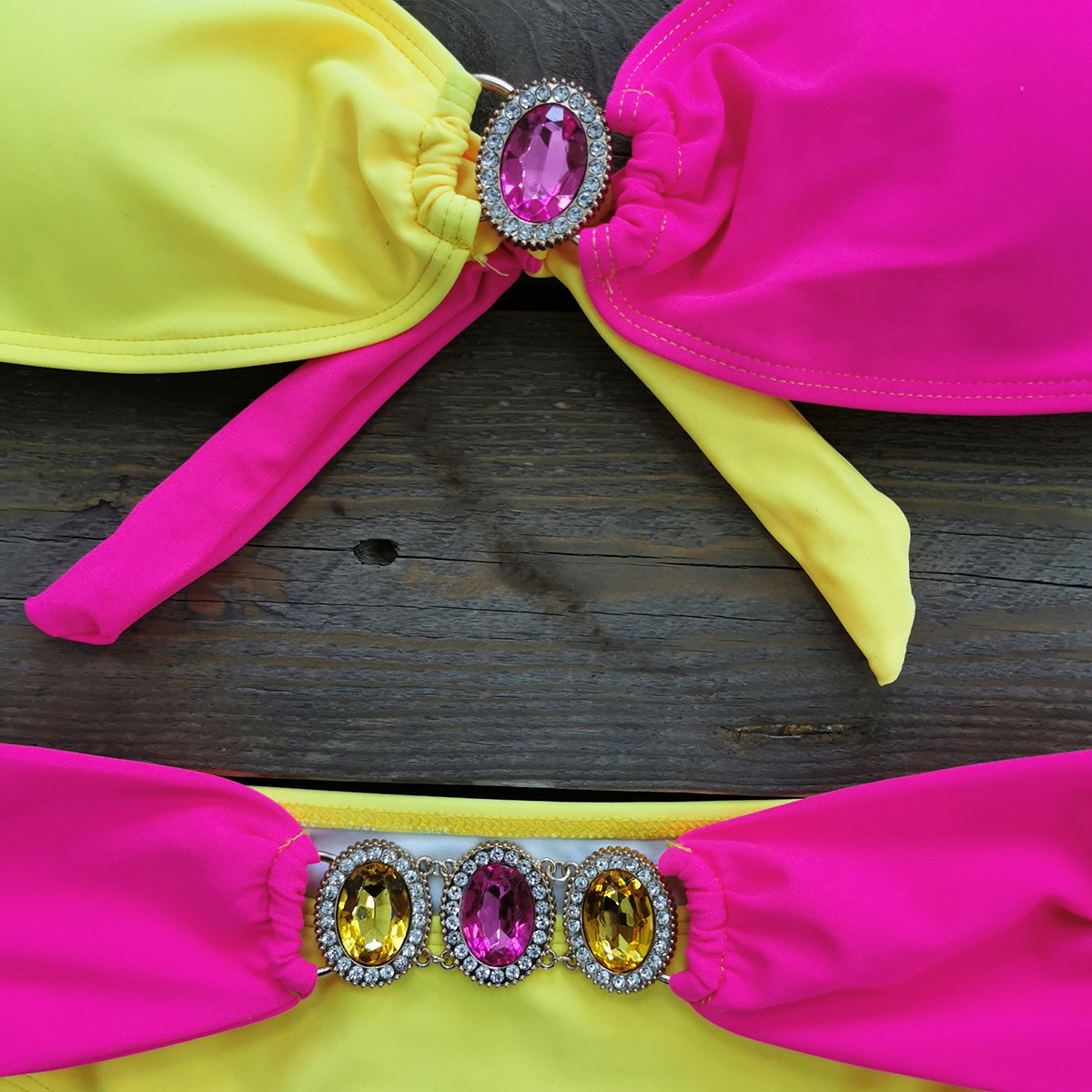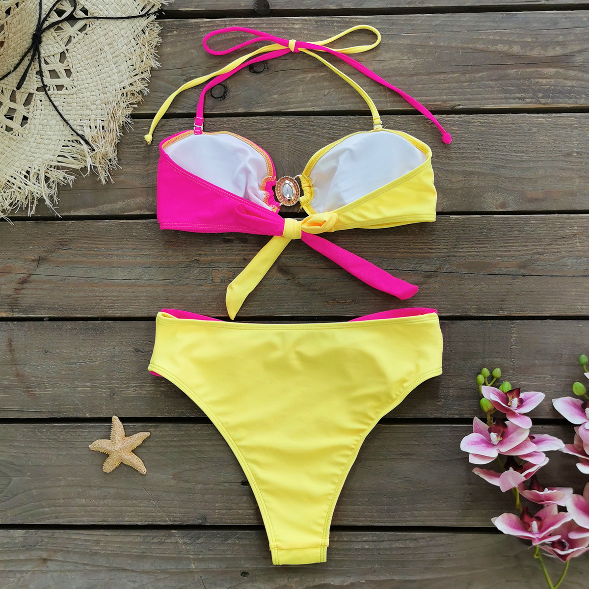 This women's bikini features a bold color-block design with pink and yellow panels. Crafted from polyester, it offers quick-drying comfort and durable shape retention for summer wear. The halter-style tube top is gathered at the center with a decorative rhinestone embellishment, creating a subtle focal point while maintaining a clean silhouette. A backless design provides a flattering neckline and easy tanning lines. The matching bottoms continue the color-block motif and include a belt-like detail with rhinestone accents for a cohesive finish. Ideal for boho and vacation style, this swimsuit pairs well with wide-brim hats and sunglasses. Season-ready and comfortable against the sun, it is designed to fit a range of body types with a soft, secure fit.