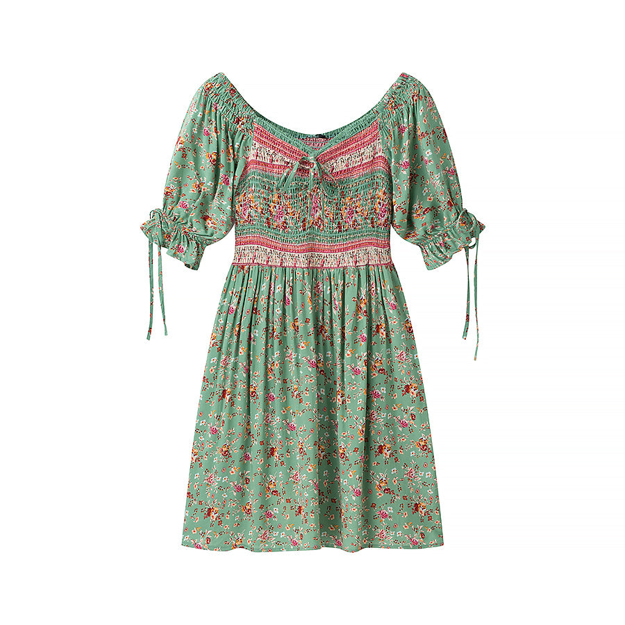 Women Clothing Autumn Green Positioning Rayon Printed Elastic Dress Women