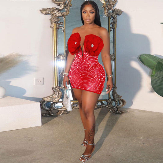 Sexy Rhinestone Pearl Deep V Plunge Floral Elastic Slim Fit Dress