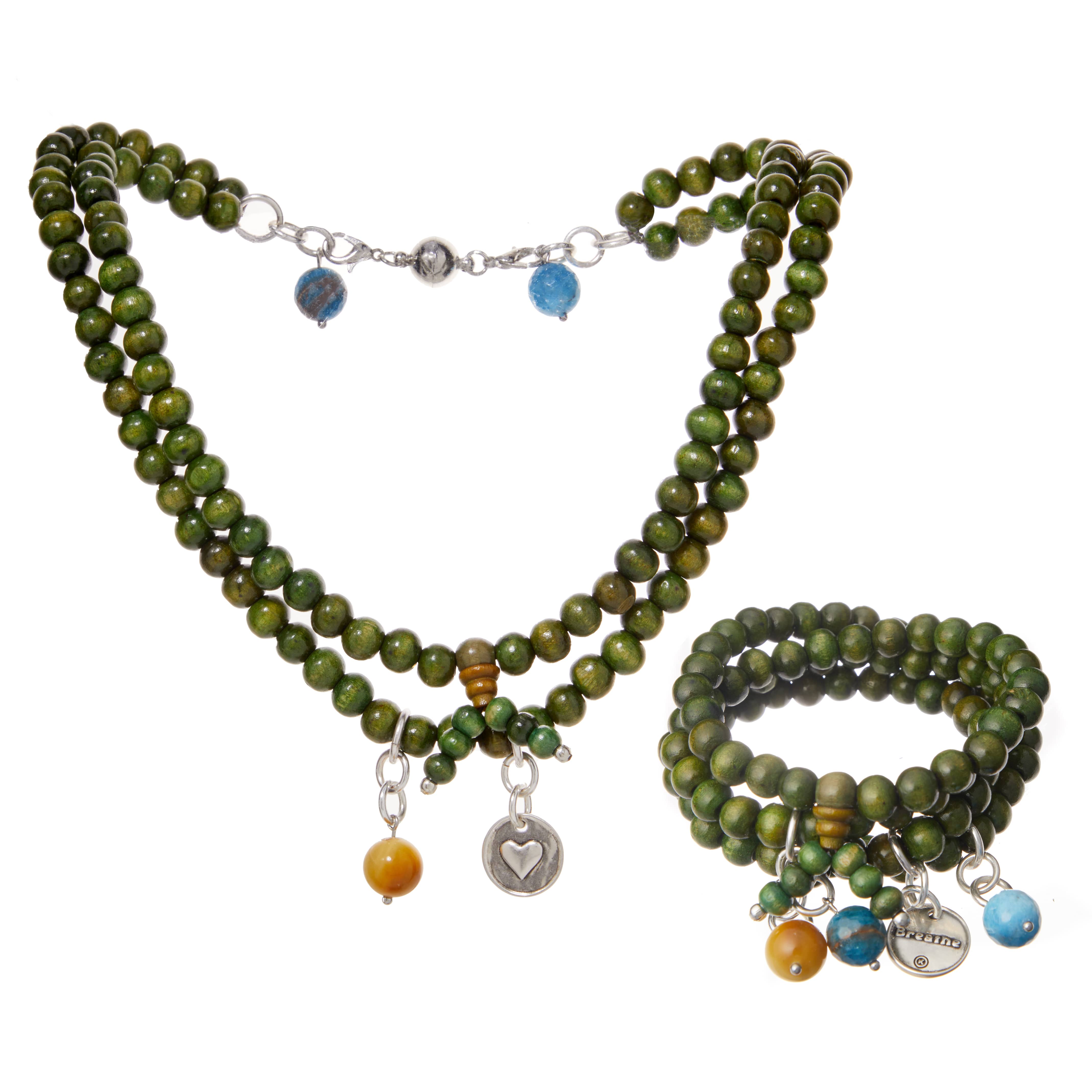 Green 6mm wooden bead Boho wrap bracelet with a silver Breathe pendant, accented with golden tiger’s eye and jasper. Finished with our magnetic clasp.