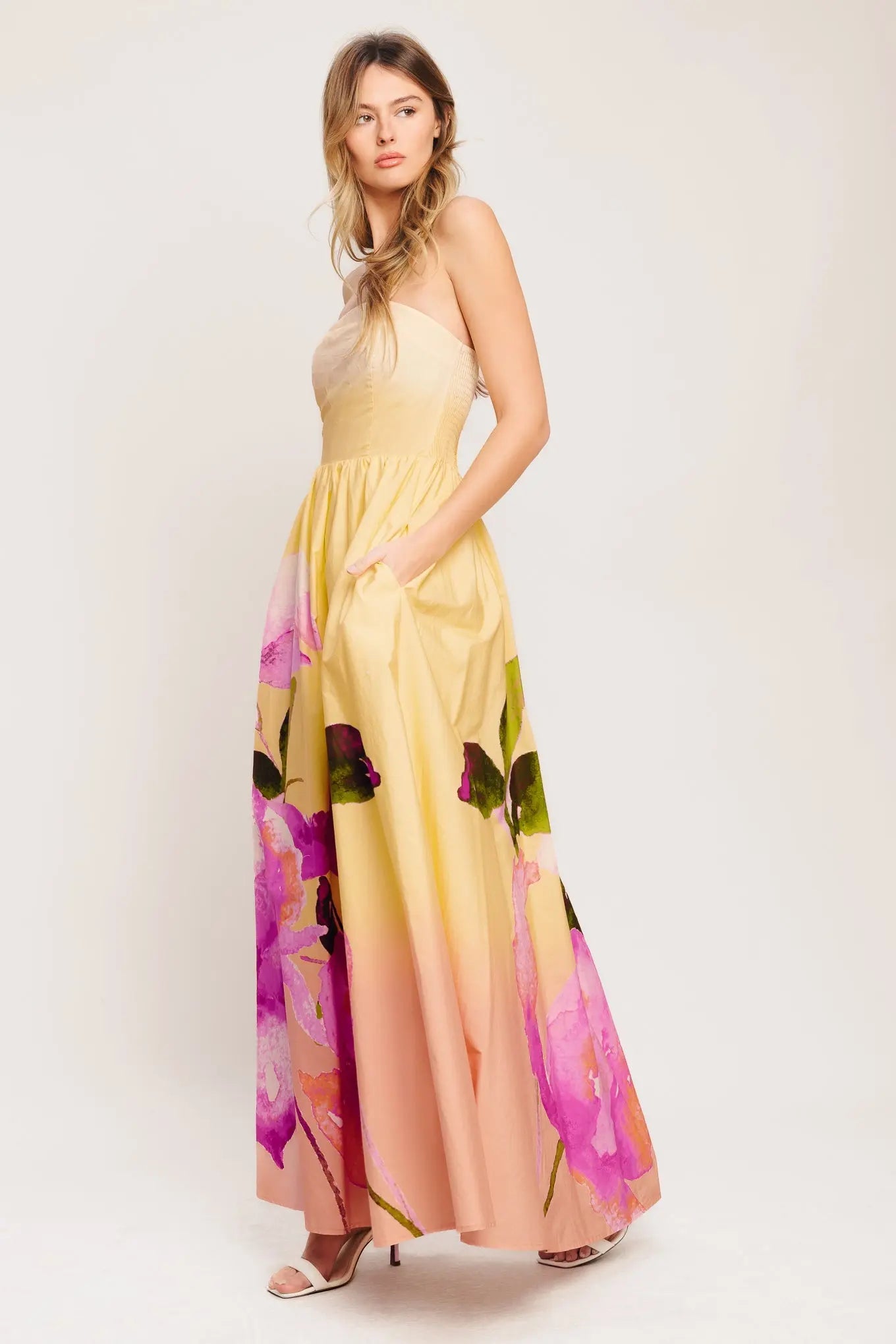 A printed woven maxi dress featuring strapless, full skirt and smocked back bodice