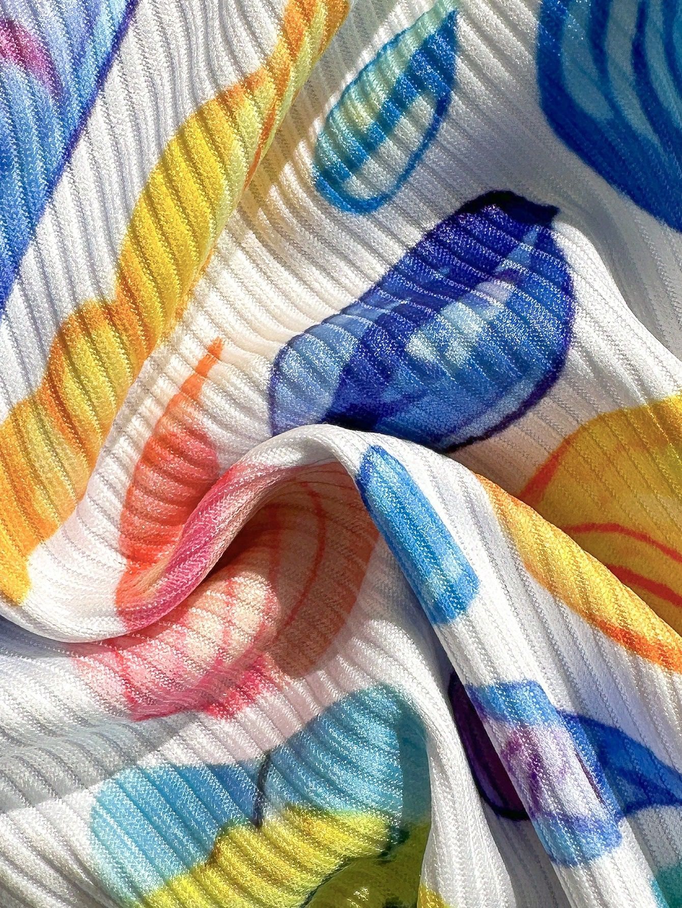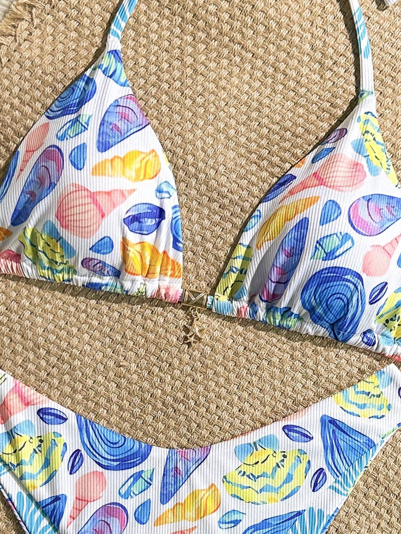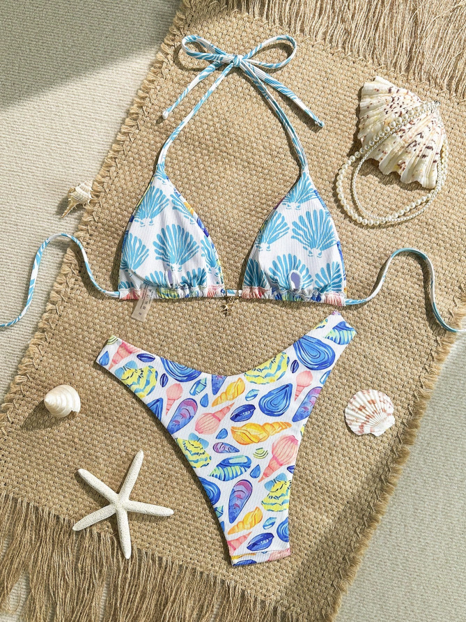 Ladies Sexy Fresh Ocean Print Halter Lace up Triangle Split Swimsuit