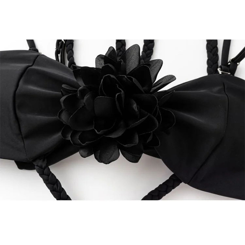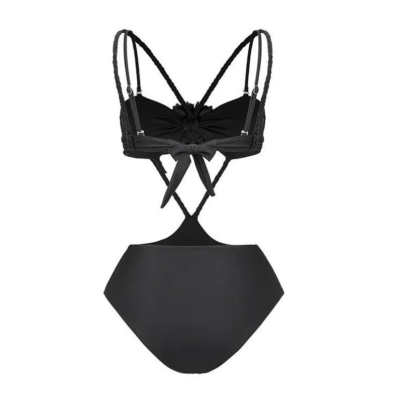 Boho-inspired and vacation-ready, this solid-color one-piece combines a daring backless silhouette with decorative braid rope straps. The shoulder straps frame a flattering neckline and cross over the torso to form a secure, minimalist lattice, while a three-dimensional floral accent sits at the center front for texture and focal interest.