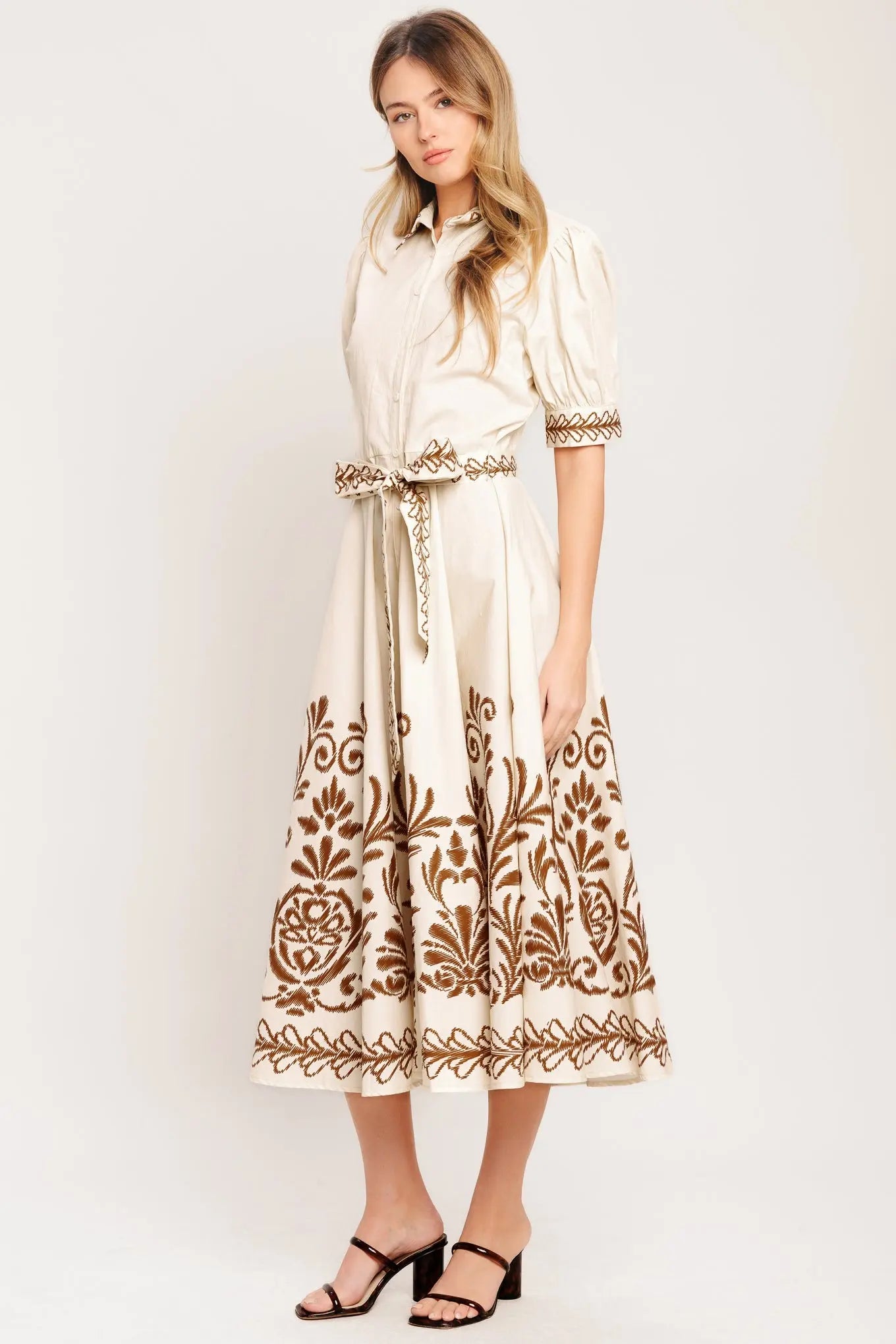 A printed woven midi dress featuring collar, long sleeve with cuff, front button down, self sash tie and full skirt