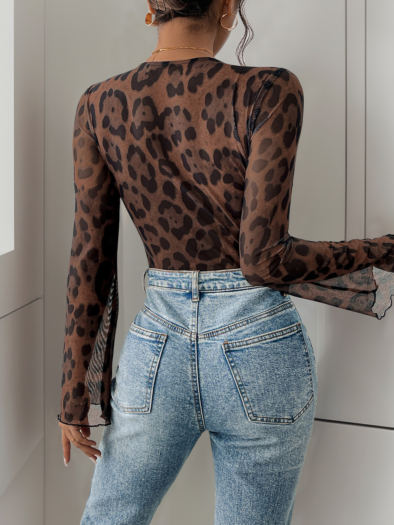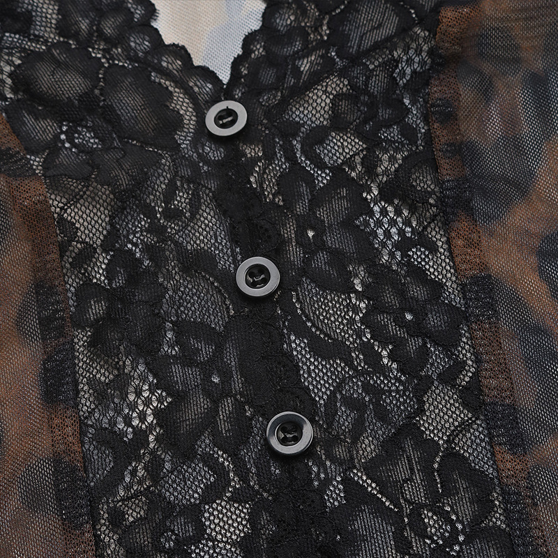 Sexy Bell Sleeve Lace Stitching Leopard Print Mesh Jumpsuit