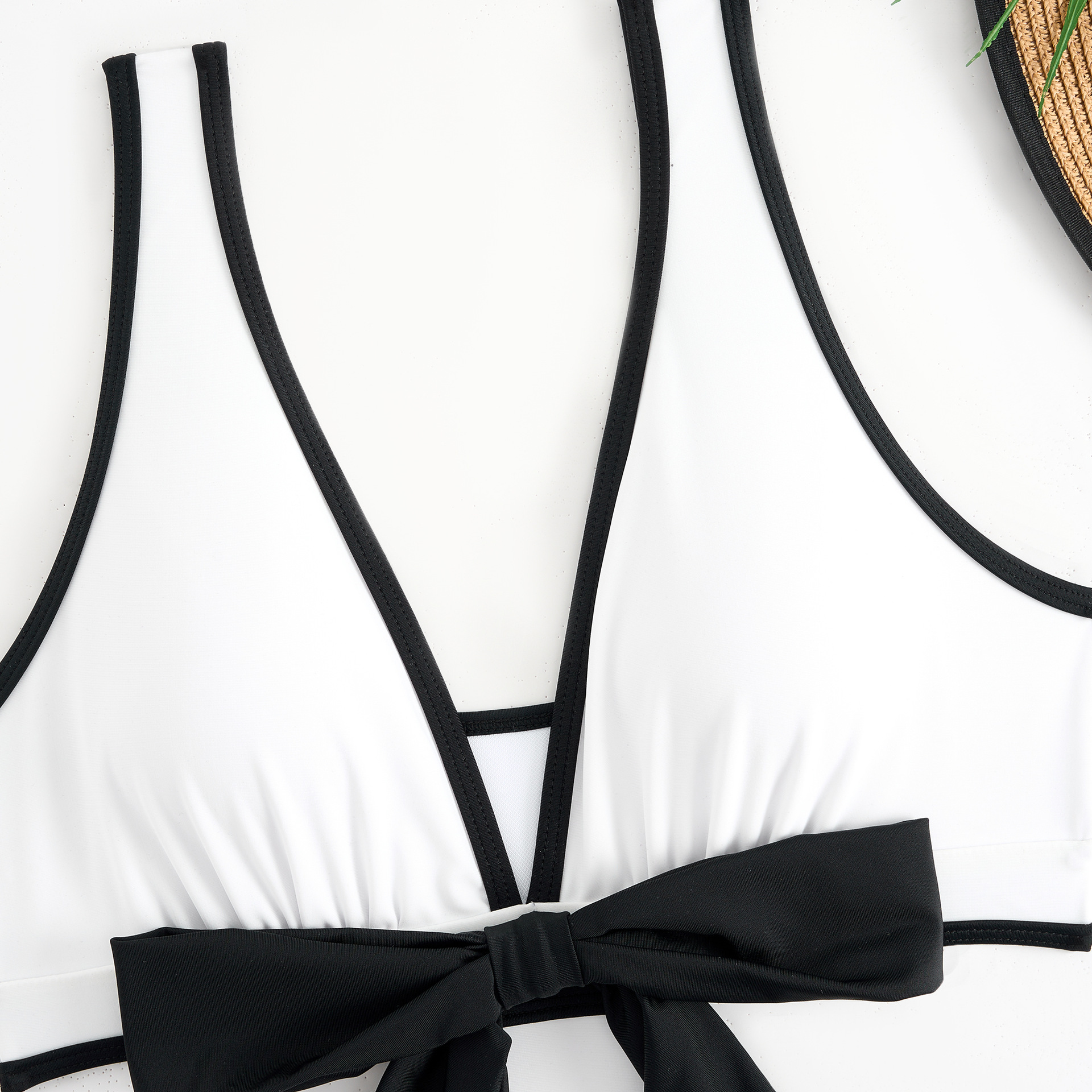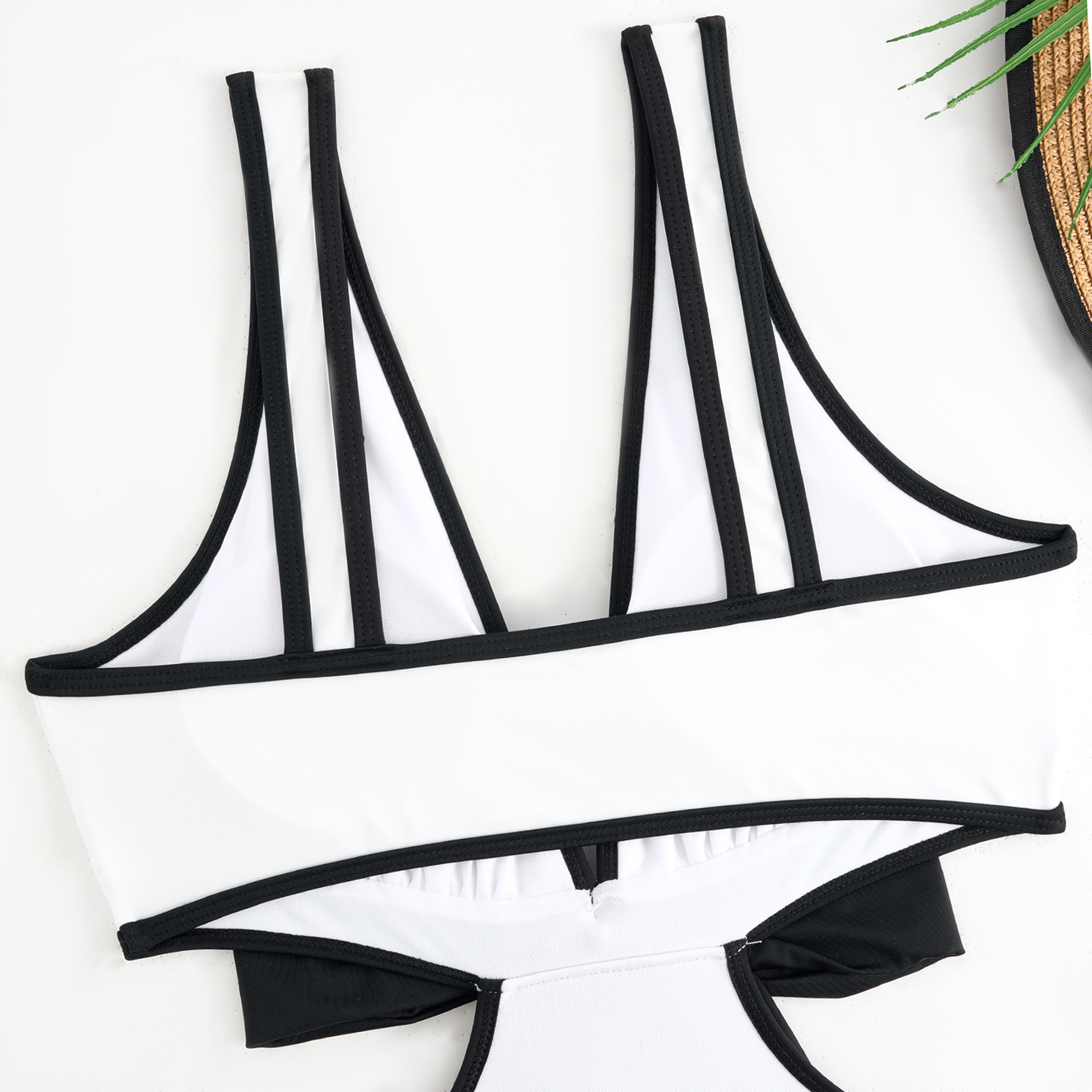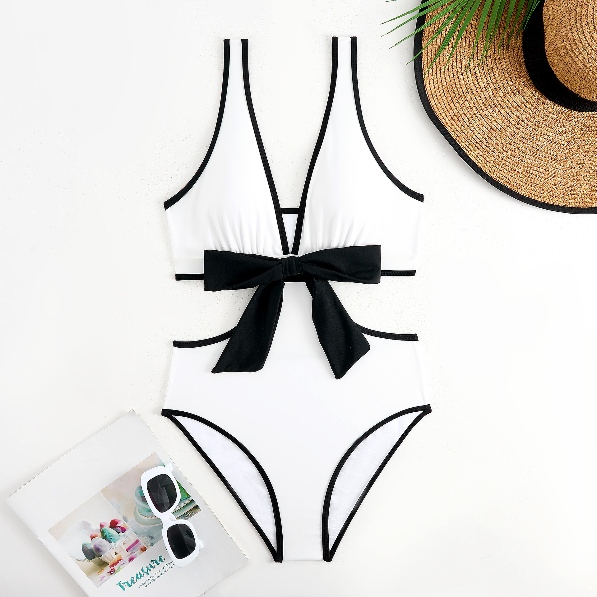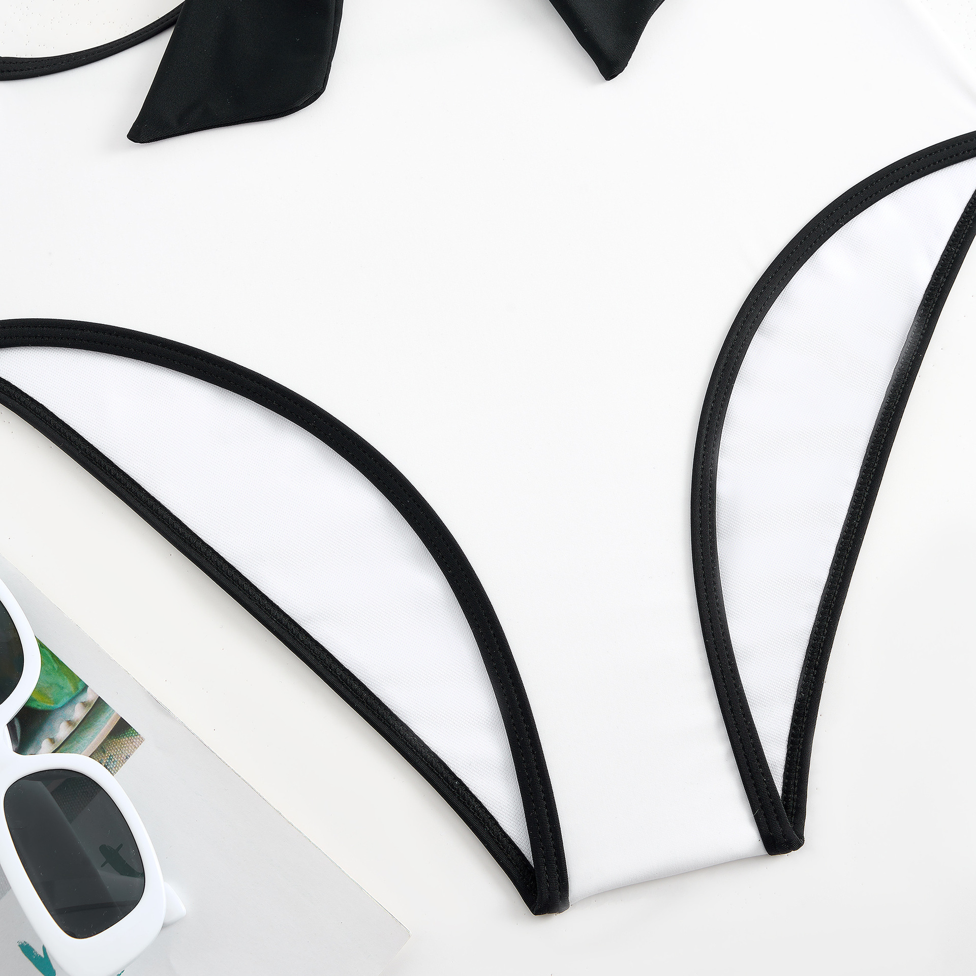 Sexy Swimsuit Women Slim Fit Slimming Siamese Triangle Solid Color Black White Patchwork Nylon Swimsuit