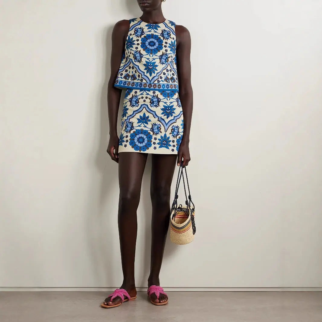 Summer Slim Blue Printed Crew Neck Top Short Skirt Two Piece Sets Bella Mia