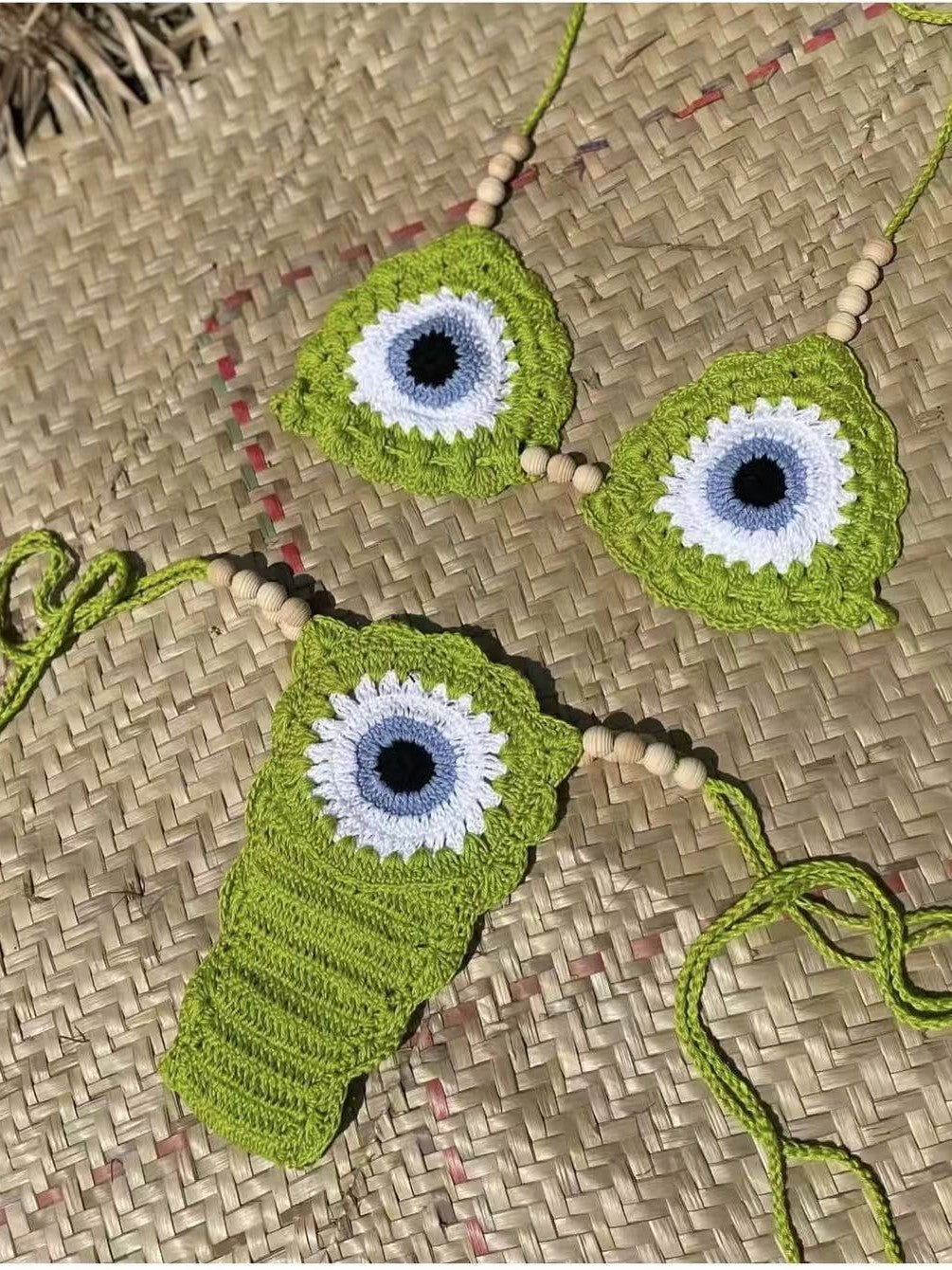 Embrace boho-chic vacation style with this Women Beach Sexy Bikini Hand-Woven Split Swimsuit. The halter-top features hand-woven crochet triangular cups with green edging and a white center, set on a jersey base for a comfortable, flexible fit. Adjustable halter straps and side ties allow you to customize coverage and support for swimming, lounging, or beachside activities. The swimsuit uses a polyester main composition, providing durability and quick-drying performance after a dip. Designed for summer days, it pairs well with resort wear and sun hats for a relaxed, airy look.